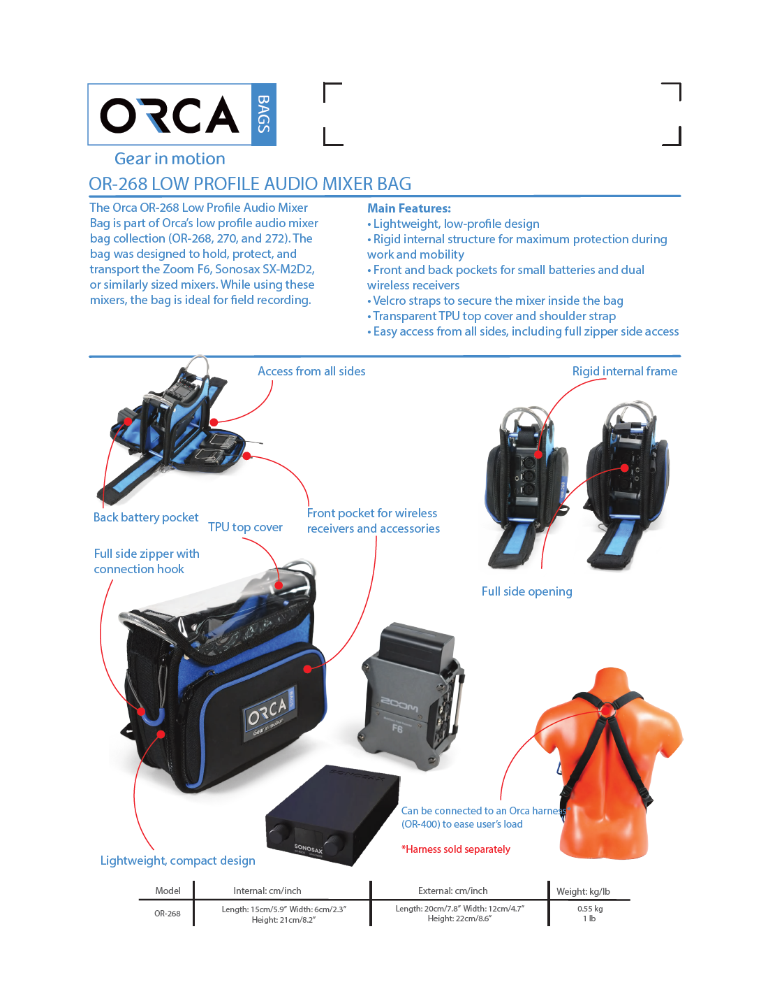 Compatible with the ORCA OR-400 harness (sold separately), the OR-268 is well suited for extended field recording sessions.