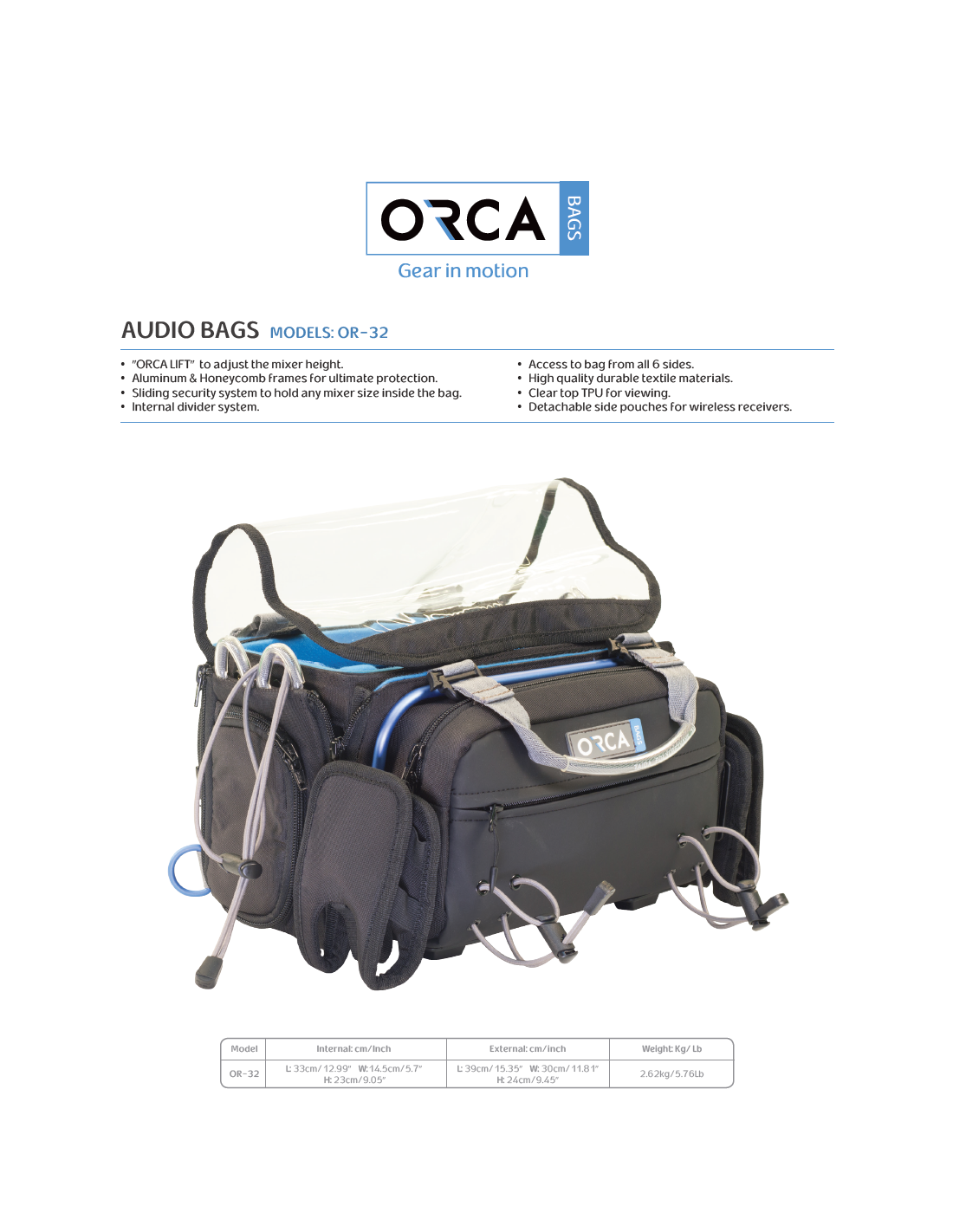 The ORCA OR-32 Audio Mixer Bag was designed for professional sound recordists working with advanced multichannel mixers such as the Zaxcom Nomad 4, 6, 8 and 12, and Sound Devices 552, 664, 788T with control surfaces and up to six wireless transmitters.