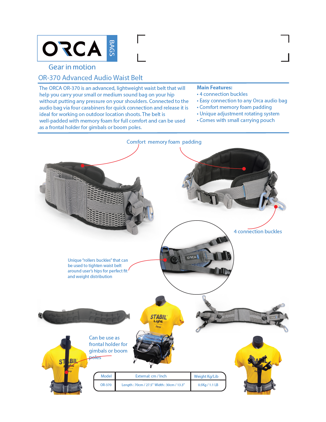 The ORCA OR-370 Advanced Audio Waist Belt was designed to provide sound professionals with an ergonomic and comfortable carrying solution for mobile recording. It allows small or medium audio bags to be supported on the hips, significantly reducing strain on the shoulders and back.