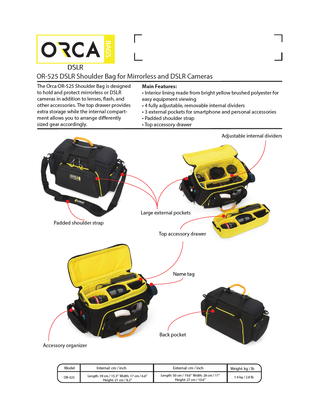 The ORCA OR-525 DSLR Shoulder Bag was designed to safely carry mirrorless or DSLR cameras together with lenses, flash and accessories.