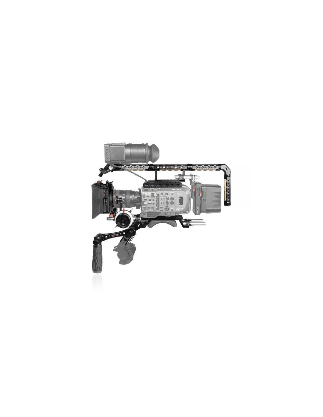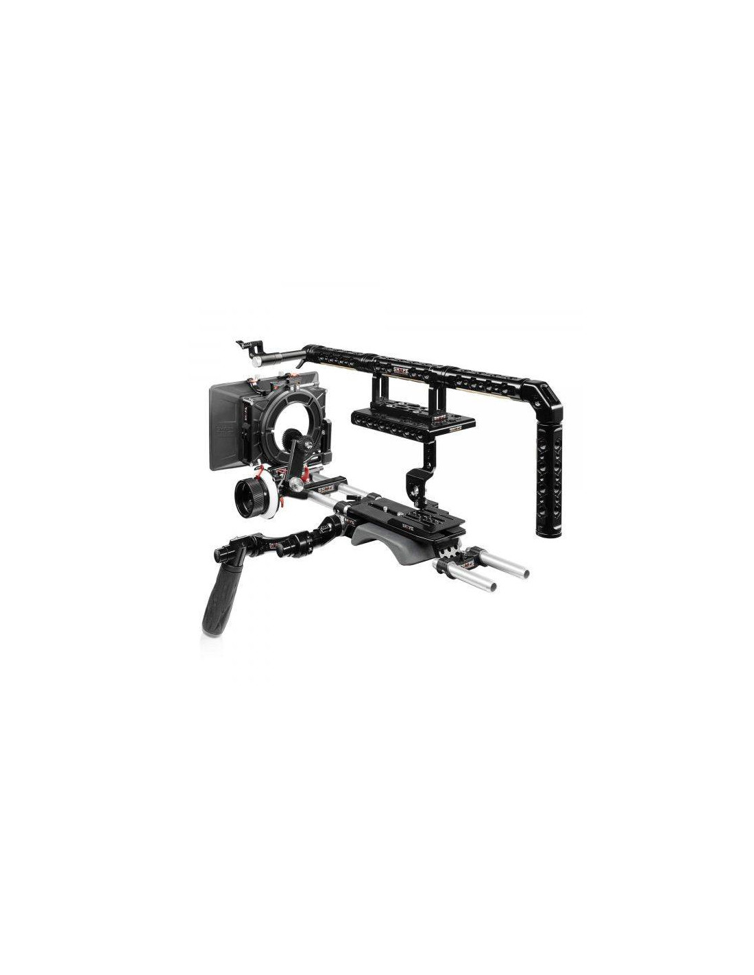 It includes top, side, and bottom plates, a shoulder baseplate with ARRI rosette, a 15 mm rod system, a push-button left handle, and a modular CNC aluminum and Canadian maple top handle.