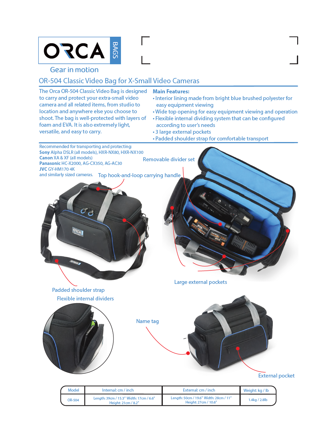 The ORCA OR-504 Classic Video Bag was designed to carry and protect extra-small video cameras and related accessories while traveling from studio to location.