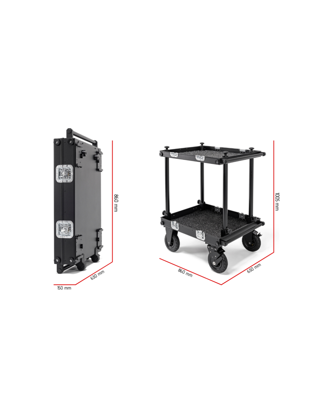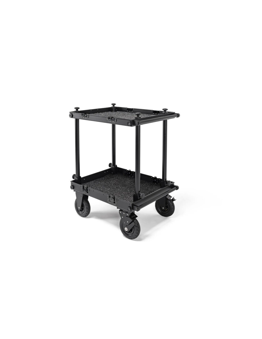 Both shelves are carpeted to prevent your gear from slipping and to provide a soft, protective surface. Incredibly quick to set up, the cart folds down into a compact suitcase-sized form that fits into the trunk of most compact cars—assembly takes under 2 minutes and requires no tools.