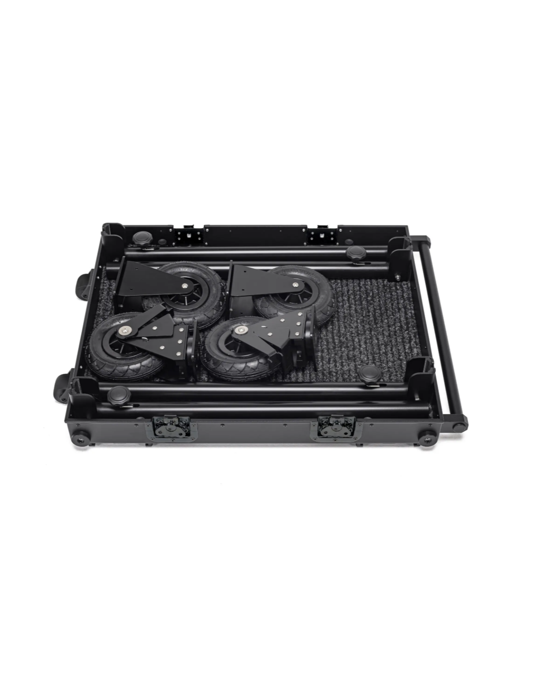 Despite its lightweight build, the MINI can transport up to 150 kg of gear, which is nearly five times its own weight. It comes with 8” pneumatic wheels (Ø200 mm) featuring sealed bearings, and the swivel wheels are equipped with foot brakes for extra stability on unpredictable surfaces.