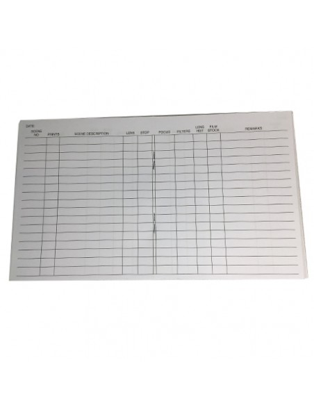 Its compact 10.5 x 12 cm format fits easily in your pocket or bag. With 80 pages in English, it includes fields for date, scene number, prints, scene description, lens, stop, focus, filters, lens height, film stock, and remarks.
