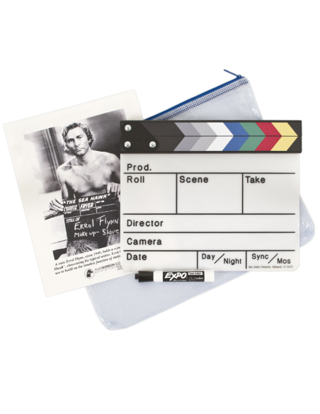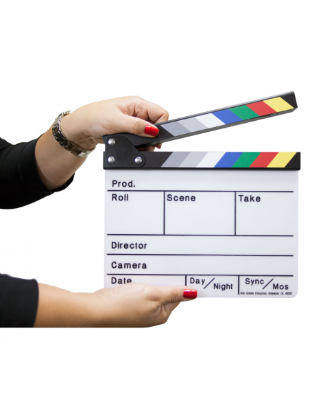 White cinema clapperboard 280 x 190 mm with USA color chart, designed for accurate camera calibration and sound/image synchronization.