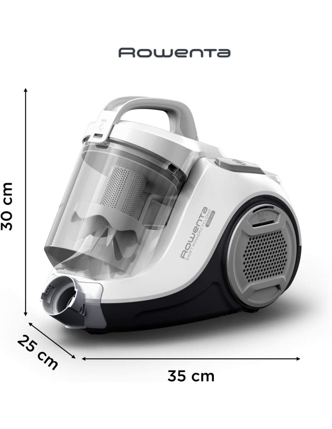 Idéal pour un nettoyage en profondeur sans contrainte, cet aspirateur sans sac offre une puissance constante de 550 W tout en restant silencieux avec un niveau sonore de seulement 69 dB. Grâce à sa capacité de 2,5 litres, son long cordon de 6,2 m et son rayon d’action de 8,8 m, il garantit une utilisation fluide et efficace sans interruptions fréquentes. Caractéristiques principales Technologie cyclonique pour une séparation optimale de l’air et de la poussière Brosse double position pour sols et brosse parquet Softcare pour surfaces délicates Puissance de 550 W pour une aspiration performante Niveau sonore réduit à 69 dB pour un confort d’utilisation Capacité du bac de 2,5 litres Rayon d’action étendu de 8,8 mètres Accessoires inclus : suceur fente, suceur ameublement plat, brosse parquet Compatibilité avec de nombreux accessoires Rowenta (Turbobrosses, bras articulés…) Alimentation secteur Excellente efficacité : 111 % sur sols lisses, 84 % sur tapis/moquettes Pièces détachées disponibles pendant 15 ans Résumé des caractéristiques Type : Aspirateur traîneau sans sac Technologie : Cyclonique Puissance : 550 W Capacité réservoir : 2,5 L Niveau sonore : 69 dB Rayon d’action : 8,8 m Accessoires inclus : Brosse parquet, suceur fente, suceur ameublement plat Compatibilité accessoires : ZR900401, ZR900601, ZR900701, ZR902901, ZR903401 Alimentation : Secteur DPU sols lisses : 111 % DPU tapis/moquette : 84 % Pièces détachées : Disponibles pendant 15 ans