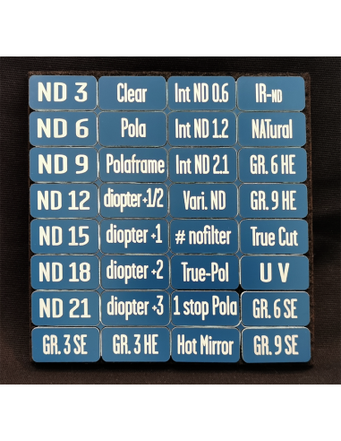 Set of 32 velcro filter ID tags (ND, POLA, GRAD, DIOPTER, etc.). Size: 3.5 x 2 cm. Available in 5 colors.