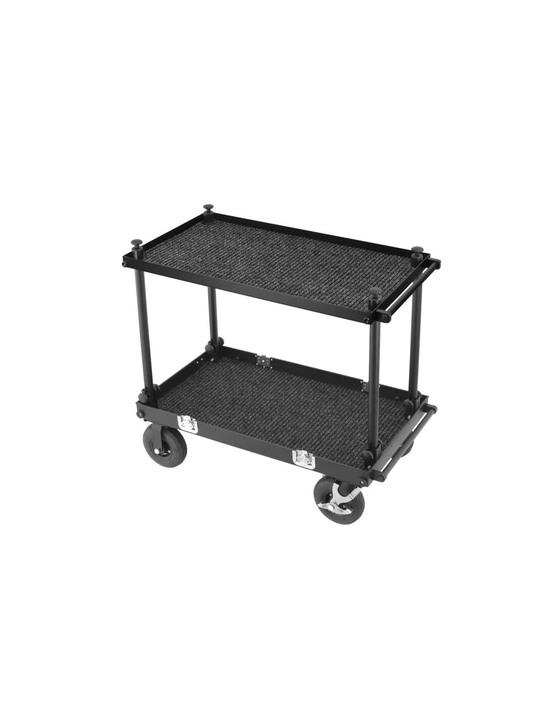 Thanks to its tool-free assembly, the cart is ready to use in under 2 minutes. It also supports a range of dedicated accessories such as heavy monitor mounts, steadicam brackets, or camera head fixtures. Additional functional features include small transport wheels, props, and deflectors.