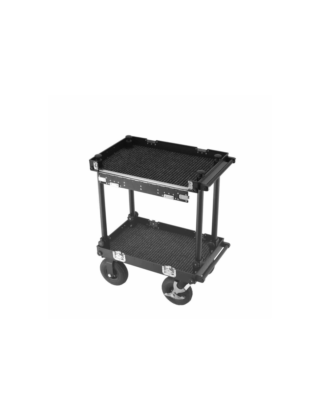 Made from anodized aluminum, this cart folds in under 2 minutes without tools. It comes with four 220 mm pneumatic wheels (2 swivel with brakes + 2 fixed), and optional 260 mm wheels are available for rougher terrain. Its maximum load capacity of 200 kg ensures suitability for demanding on-set use.