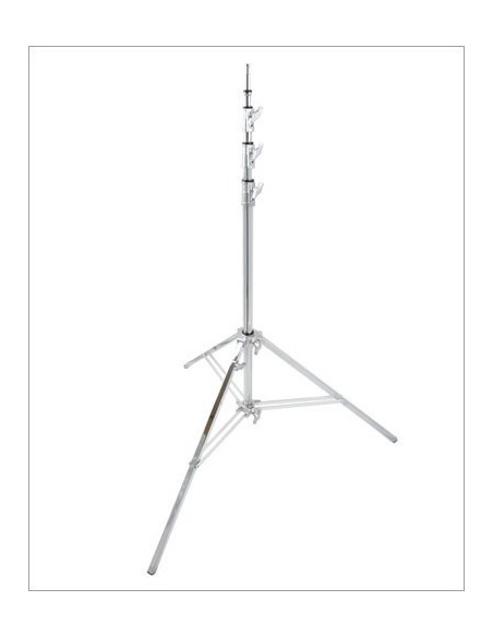 The KUPO 155M is a high-strength chrome-plated steel stand designed for maximum stability, even on challenging surfaces. Featuring 3 risers and 4 sections (diameters 35 mm, 30 mm, 25 mm, 20 mm), it supports a maximum load of 25 kg. Its built-in leveling leg ensures precise adjustment on uneven ground, providing extra safety for heavy equipment. With a height range from 107 cm to 420 cm and a wide footprint diameter of 137 cm, it offers outstanding versatility for both studio and location use. Weight: 8.0 kg.