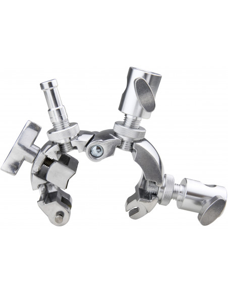 The KUPO KCP950P 4-point clamp is designed to provide secure mounting for lights and accessories on tubes with a diameter of 40 to 55 mm. It features 4 recessed mounting points positioned every 90° for versatile placement. Its locking collar mechanism ensures quick and secure installation. With a load capacity of up to 30 kg, this clamp is ideal for professional rigging in film, stage, and live production environments.