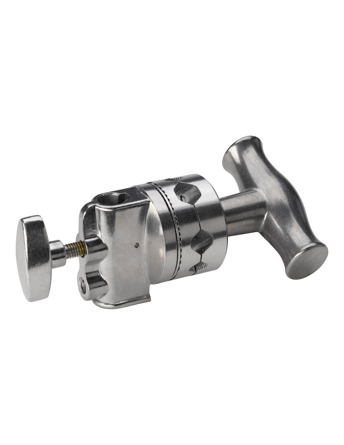 The 2-1/2" Grip Head consists of a pair of rotating aluminum discs attached to a 5/8" (16 mm) receiver. The discs have four different sized V shaped jaws to accept any accessory with a 5/8", 1/2", 3/8", or 1/4" mounting stud or tubing. The V shaped jaws have teeth that grab whatever is mounted between the plates securely. The 2-1/2" Grip Head features an oversized ergonomic T handle and dedicated roller bearings designed for maximum torque. It uses a non-slip aluminum friction disc that will maintain its durability over time that offers the user positive locking strength and precise control. It is constructed around a solid steel central bolt with a fixed solid pin to secure it to the aluminum casting for increased strength and durability. The 2 1/2" Head is most often used in conjunction with a grip arm giving you complete flexibility to position gobos such as flags scrims and silks as well as other accessories virtually anywhere.