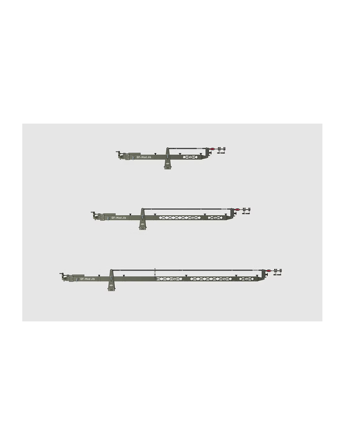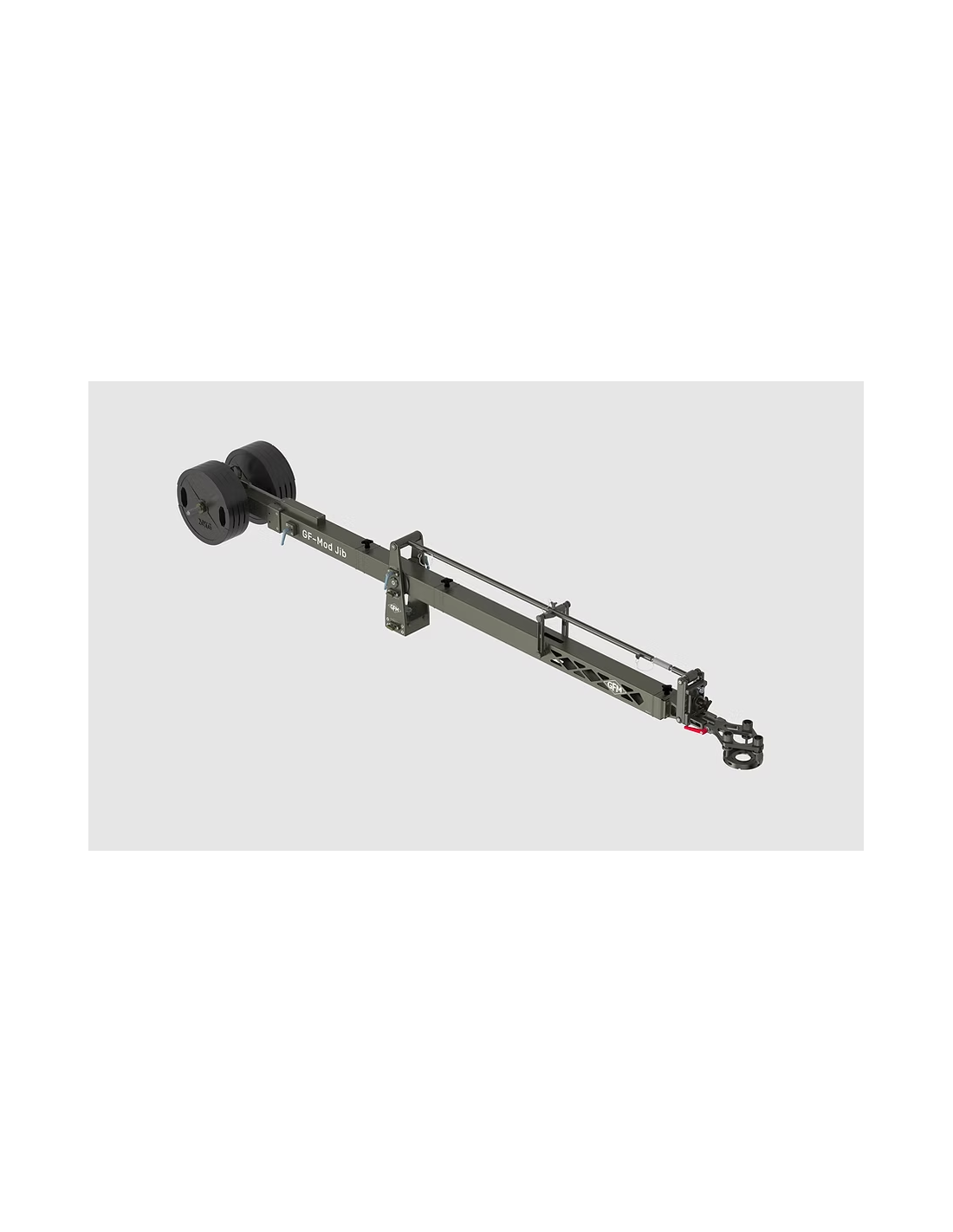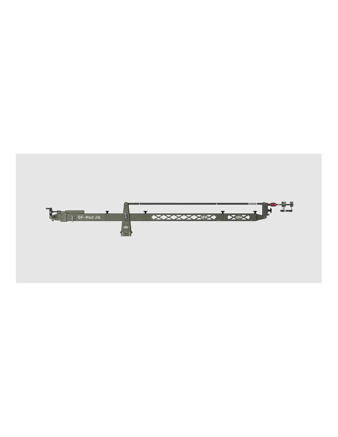The GF-Mod Jib is engineered for maximum flexibility on set. Its three core extensions (150 cm, 120 cm, 50 cm) and optional 80 cm add-on can be combined in any order via a backlash-free dovetail system. This allows fast, stable configuration changes to match the space available or the creative needs of the shot. Ideal for mounting on dollies or tripods, the system supports Mitchell-mounted heads with smooth and controlled tilting action.