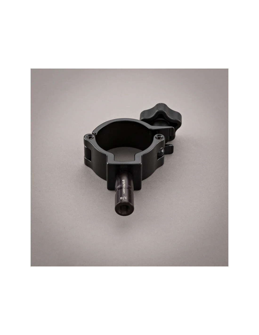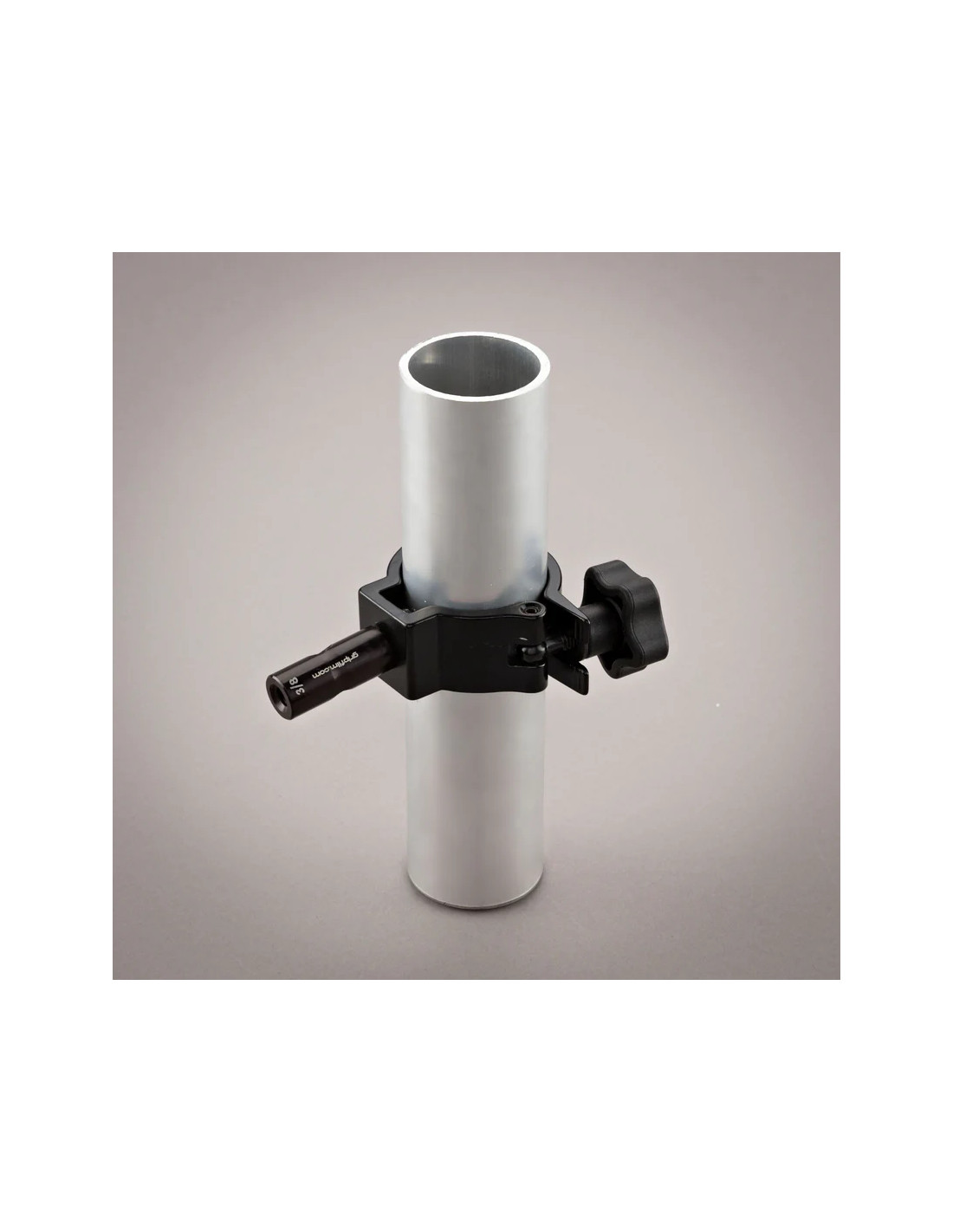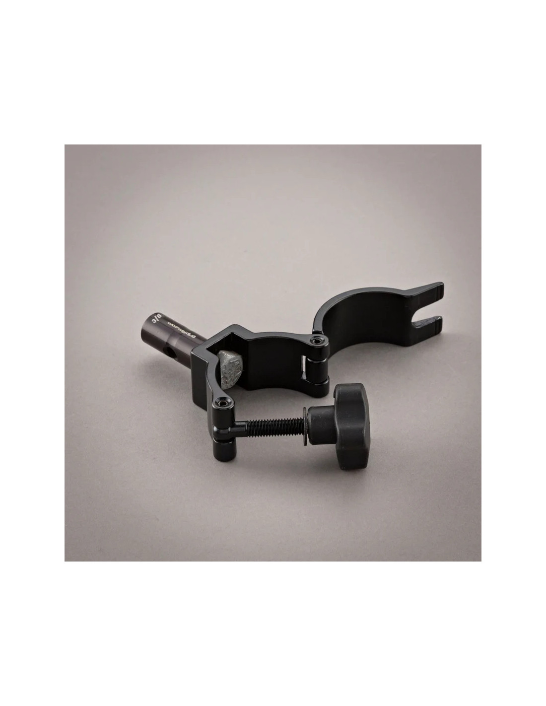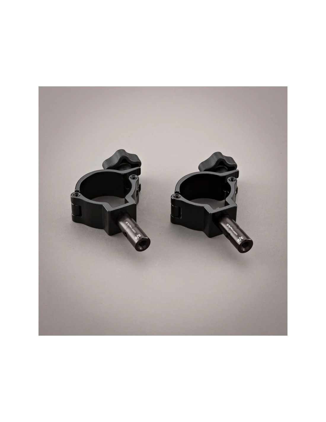 Built for professional rigging, this set features two black anodized aluminum scaffold clamps (48.3 mm) with ergonomic M8 lobe knobs, and two 16 mm (5/8") starter pins with 3/8" female thread. Laser-engraved, TÜV approved and rated for up to 100 kg, it delivers secure and efficient on-set mounting.