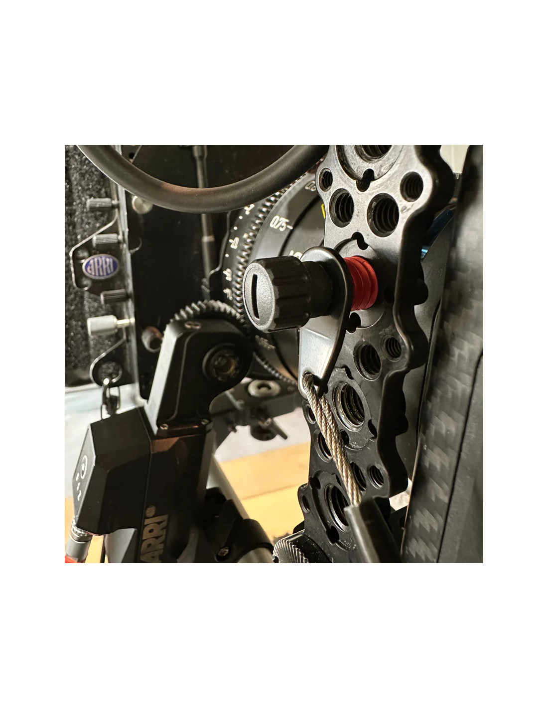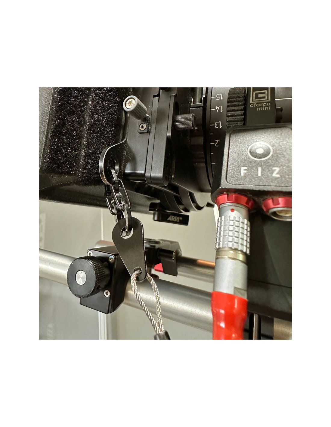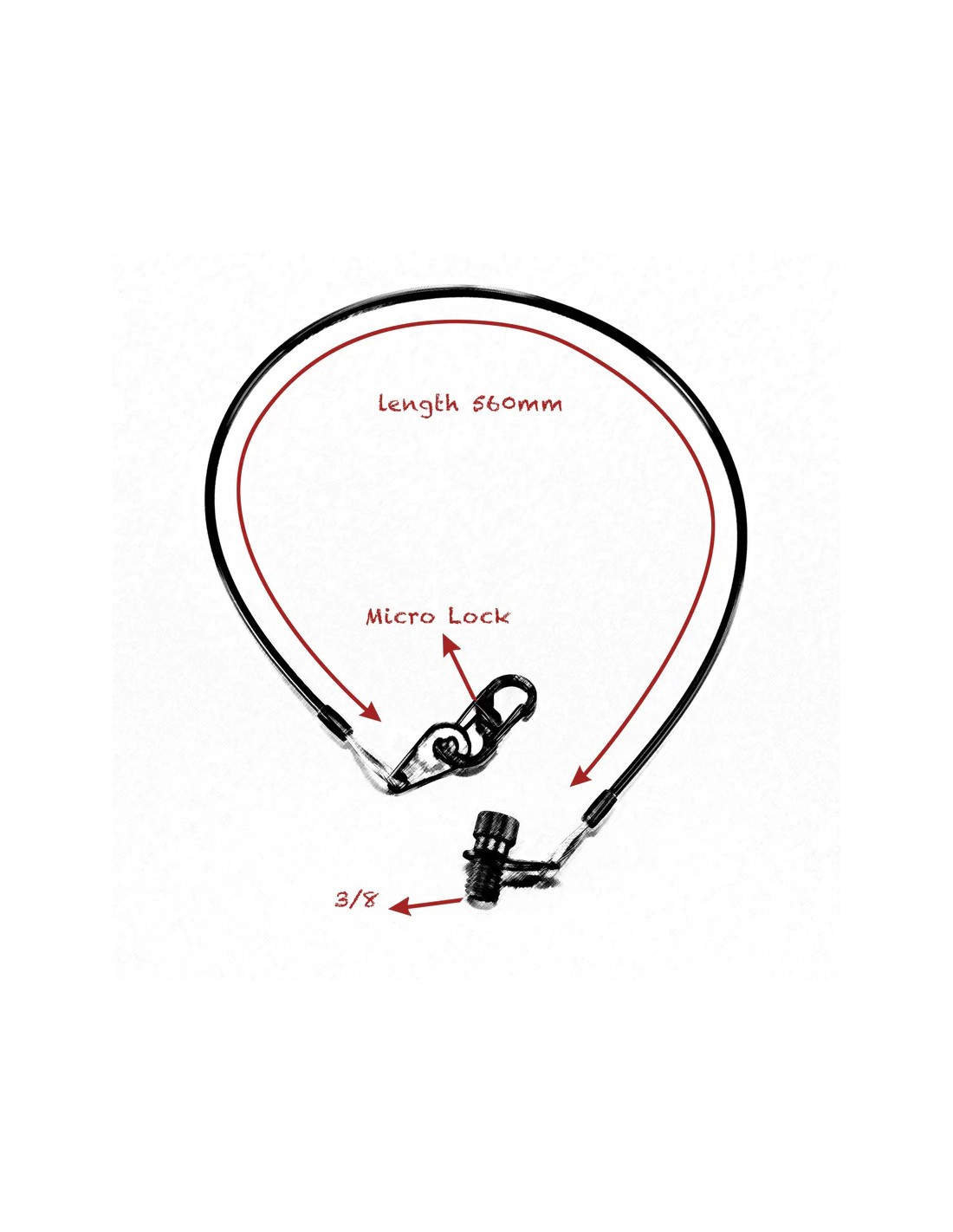 The 560 mm black stainless steel safety wire includes a 3/8" male thread, a red anodized aluminum end cap, and a plastic knob for quick handling. Designed to tether a mattebox securely to your rig, it provides extra protection against accidental detachment. The included carabiner allows easy attachment to cages, handles, or grip systems.
