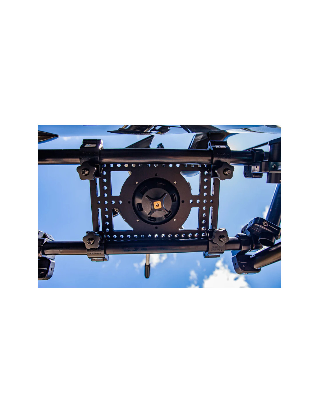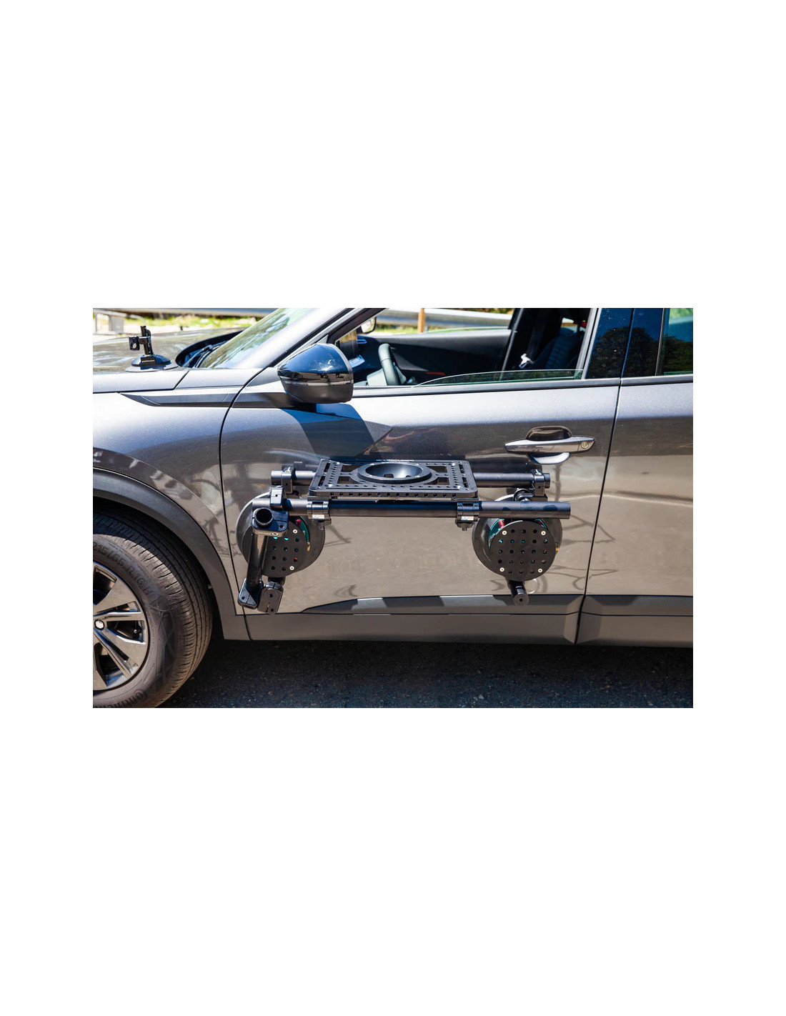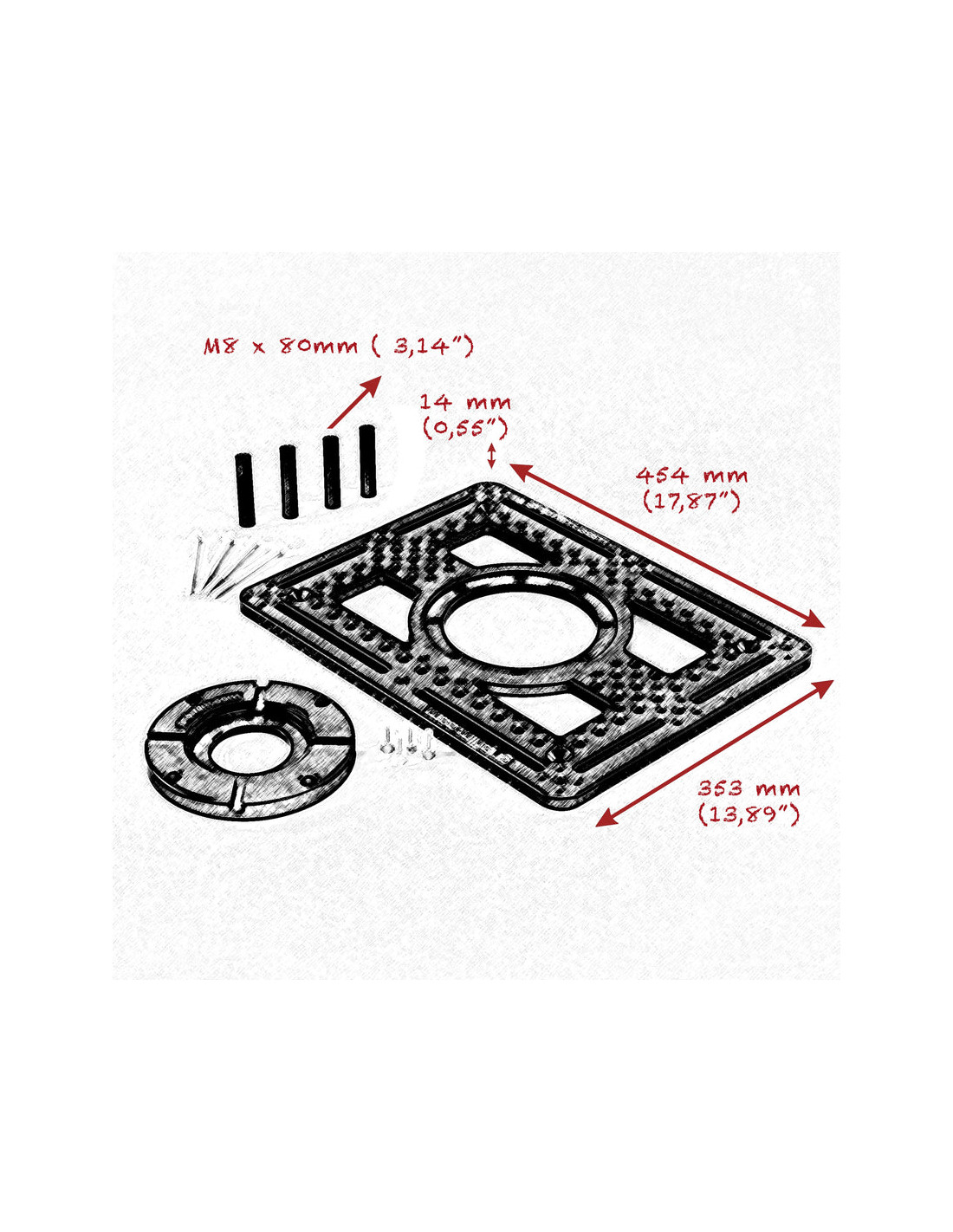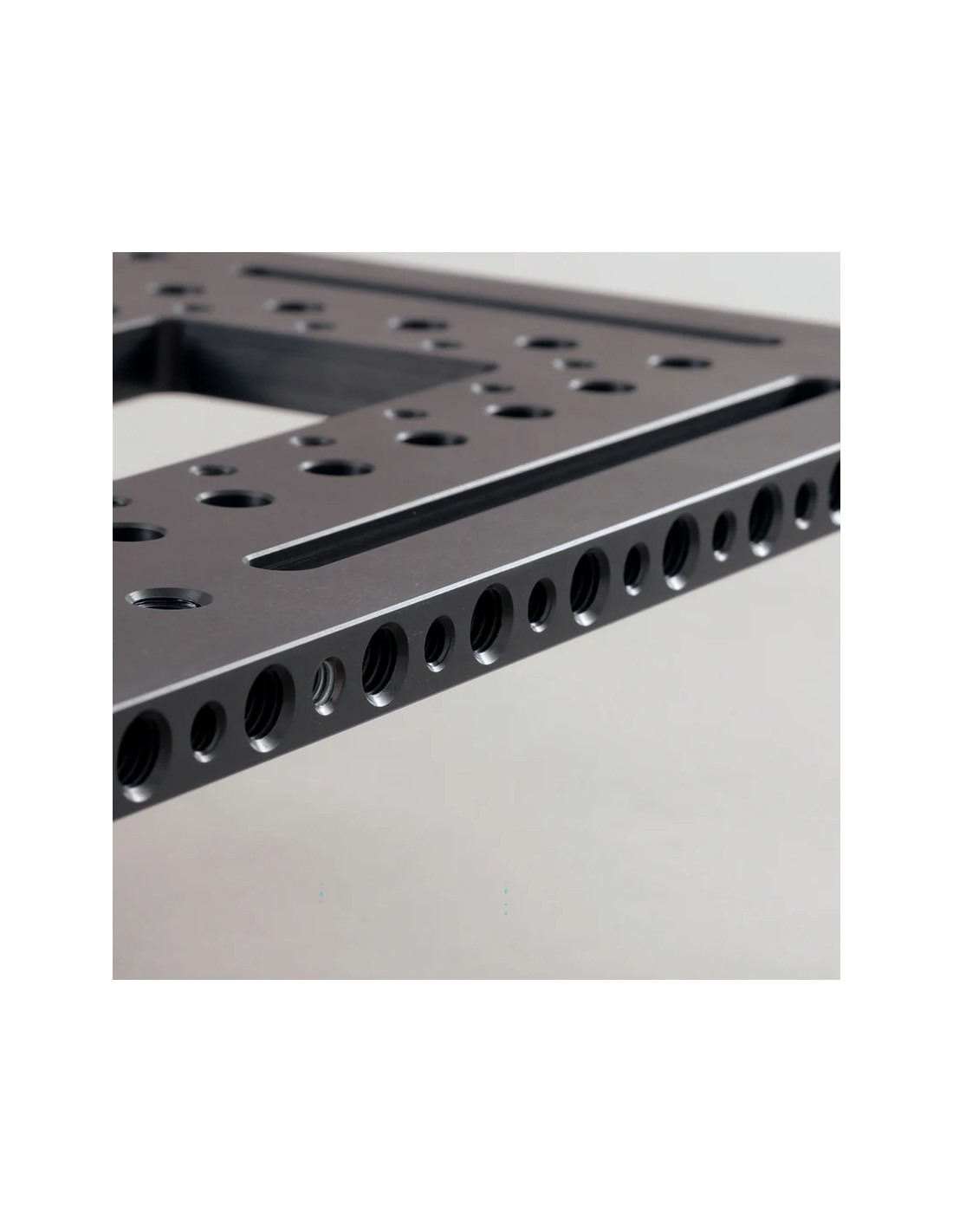 The Mitchell Cheese Plate measures 454 x 353 x 14 mm and includes an integrated Mitchell base, 2.4" spacing for dovetail plate compatibility, and both 3/8"-20 and 1/4"-20 female threads. With four keyway grooves and a high-strength anodized aluminum construction, it supports heavy camera builds with precision. Comes complete with stainless steel height extensions and bolts.