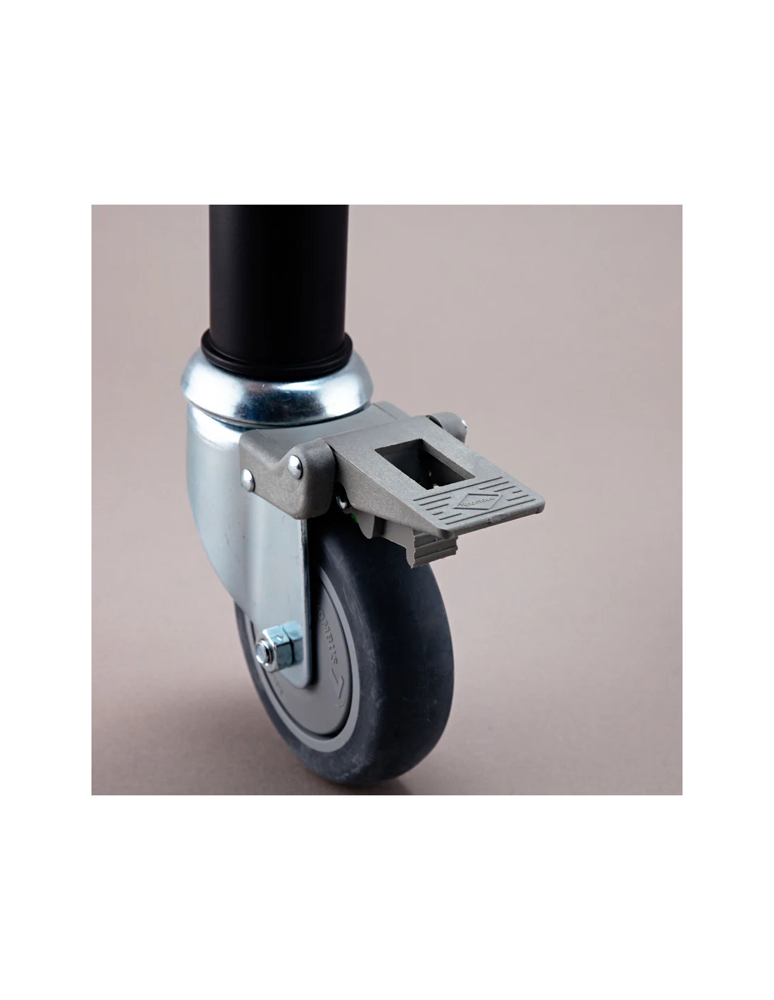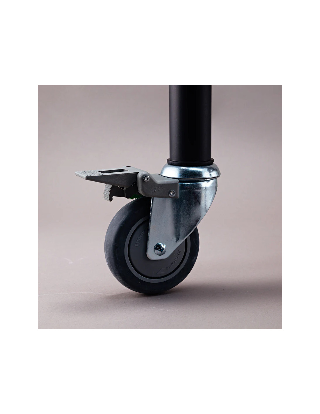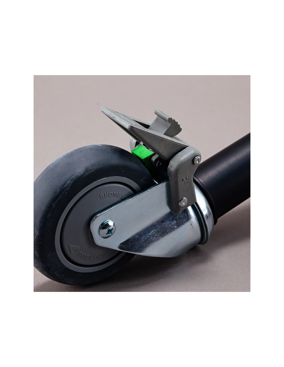 Each 100 mm swivel wheel features a double ball race bearing system for smooth motion under load, along with a high-precision brake for secure positioning. With a load rating of 100 kg (220 lb) per wheel, the system is built to handle demanding studio or on-location conditions. Protective plastic seals guard the bearings from dust and water spray, extending operational durability.