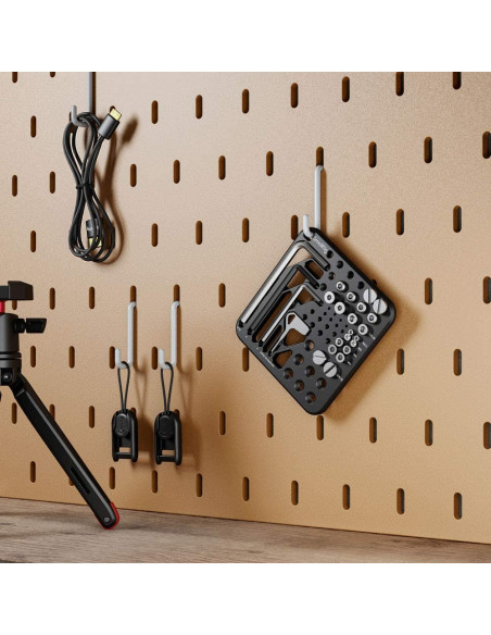 The SMALLRIG MD3184 screw and hex key storage plate is designed to keep the most common tools and fasteners for camera rigs neatly organized and easy to transport. It includes multiple hex keys (3/16, 3, 4, 2 mm / flat screwdriver) and a full set of screws: 2 flat head 1/4"-20 screws, 8 hex 1/4"-20 screws for cages, L-brackets, QR plates, baseplates, handles, and monitors, 2 M4 hex screws, 2 M5 hex screws, 2 M3 cylindrical head screws for rosette mounting, 2 M2.5 hex screws for cage anti-twist, and 2 flat head 3/8"-16 screws for QR plates and baseplates.
