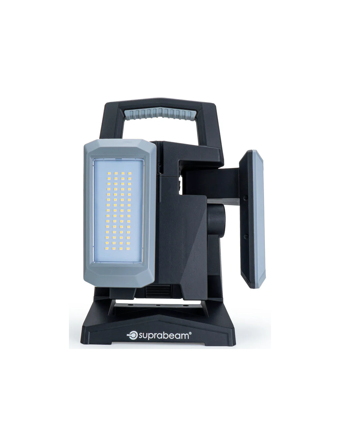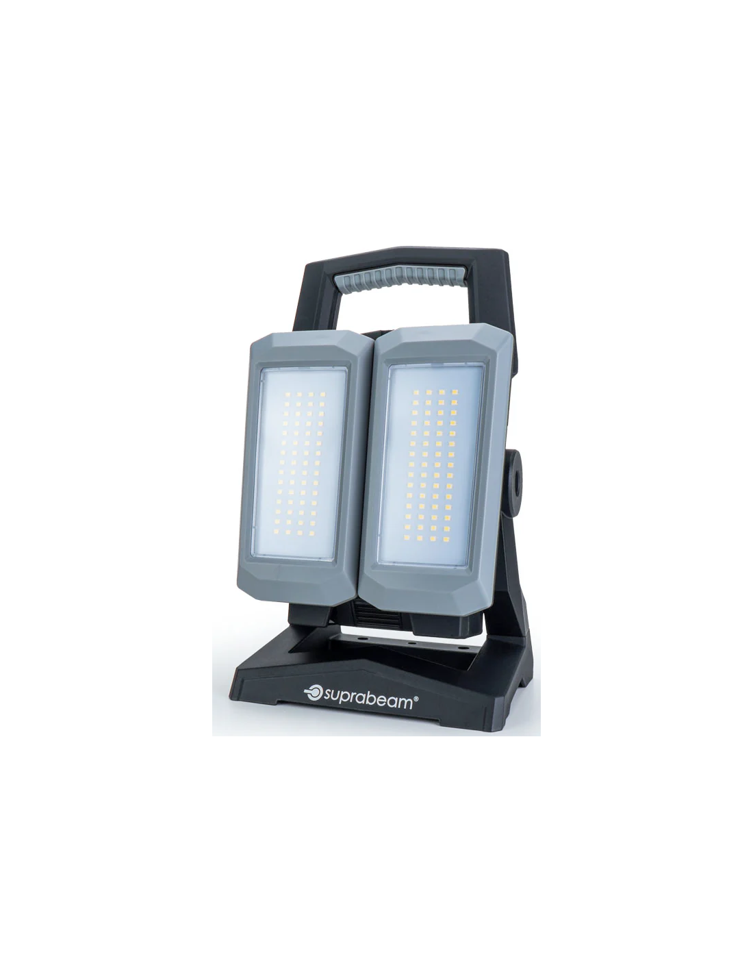 Projecteur rechargeable Suprabeam W6R – Double tête LED 4600 lm – IP54 Le Suprabeam W6R est un projecteur LED rechargeable de dernière génération, doté de deux têtes orientables permettant une diffusion multidirectionnelle de la lumière. Avec ses 4600 lumens de puissance maximale, il offre un éclairage haute intensité, idéal pour travailler dans l’obscurité totale, que ce soit sur un plateau, en loge technique ou sur un chantier. Compact, robuste, et alimenté par une batterie Li-ion performante, il assure une autonomie modulable jusqu’à 14 heures, tout en intégrant une fonction powerbank USB. Conçu en plastique technique ultra-résistant (IK07) et certifié IP54, le W6R résiste à la poussière, aux projections d’eau et aux conditions extrêmes. Sa poignée ajustable à 90° et ses panneaux lumineux pivotants à 180° permettent une utilisation ultra-flexible, avec la possibilité d’éclairer deux zones simultanément.