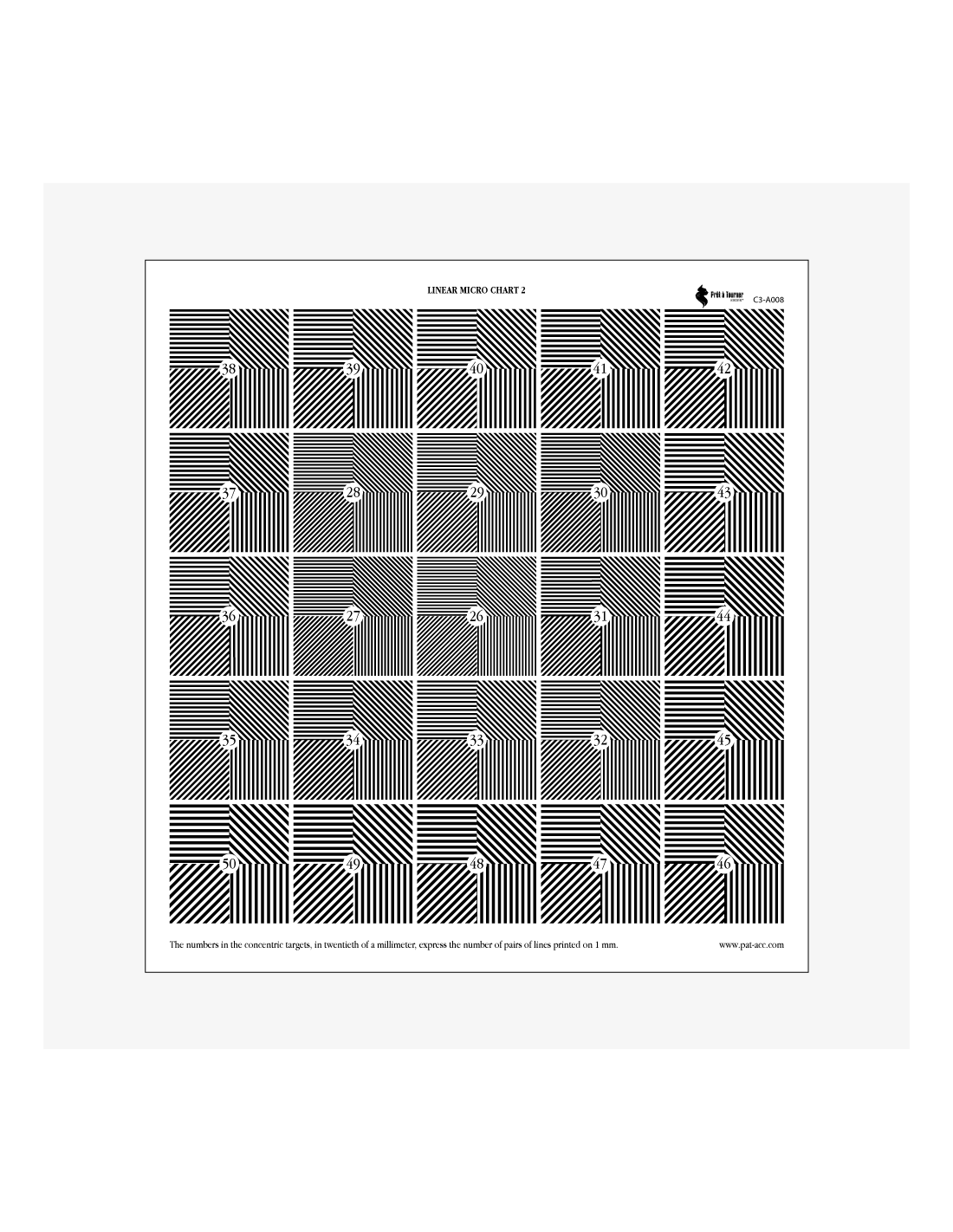 The BACKLITE Linear MICRO chart n°2 (27×29 cm) is intended for lightbox use and features a 25×25 cm test area composed of 25 linear targets with progressive gaps from 26 to 50.