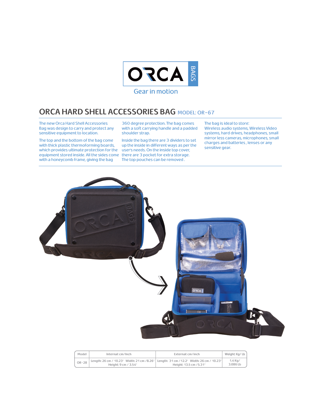 The OR-67 is ideal for transporting wireless audio and video systems, hard drives, headphones, compact mirrorless cameras, microphones, chargers, batteries, lenses and other delicate gear.