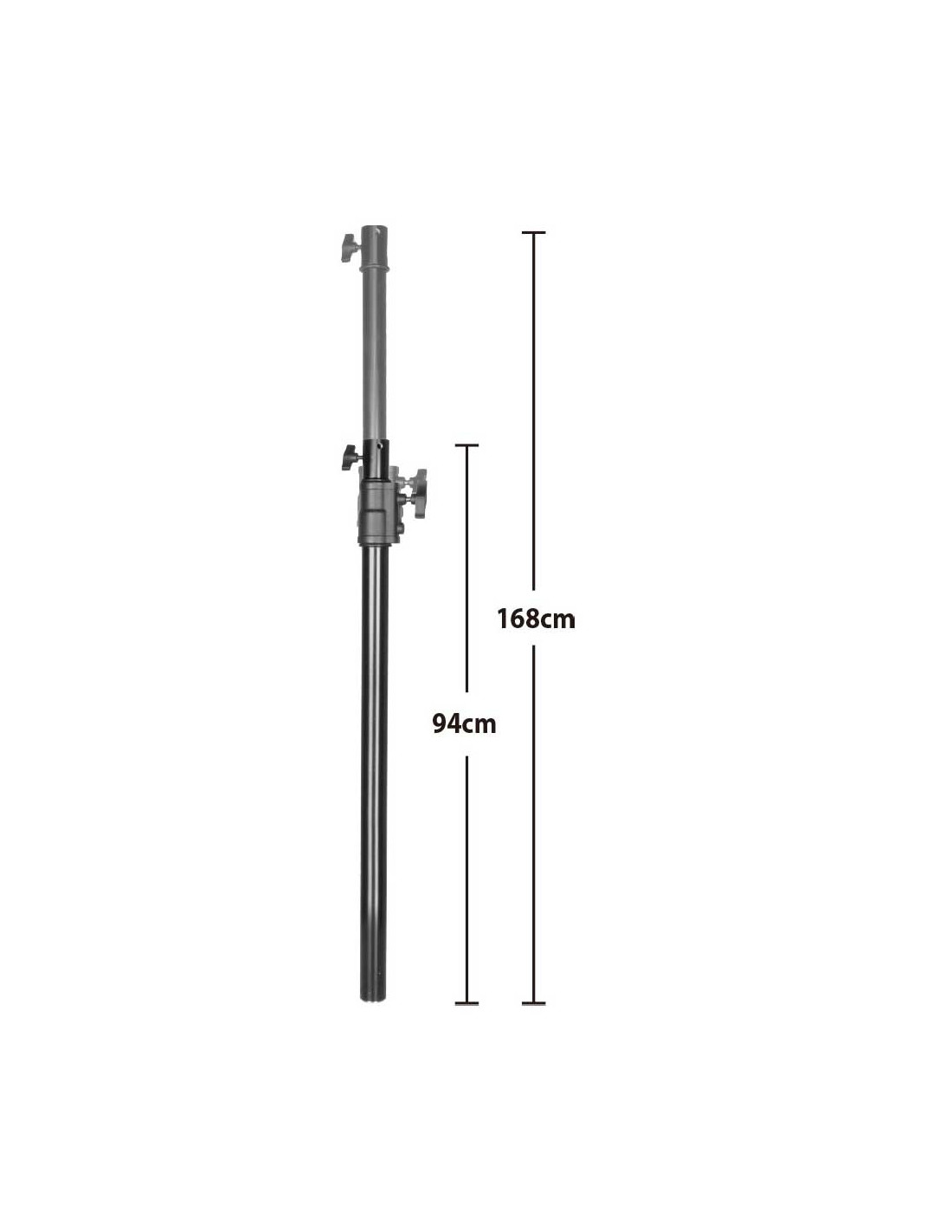 The KUPO heavy-duty telescopic mast is built from black powder-coated steel, ensuring durability and strength for on-set applications. Featuring two sections (Ø 45 mm and Ø 40 mm), it extends smoothly from 94 cm (3’) to 168 cm (5.5’), offering precise height adjustment.