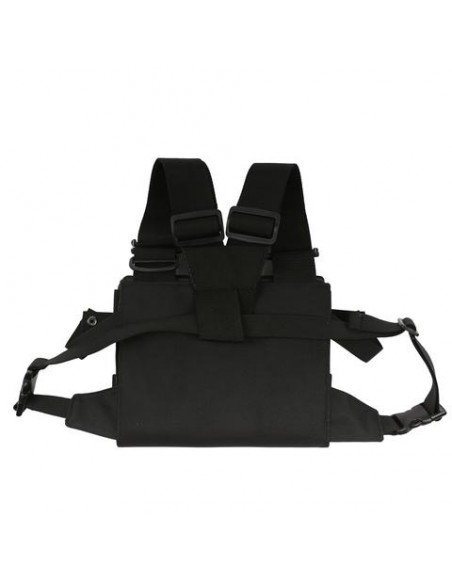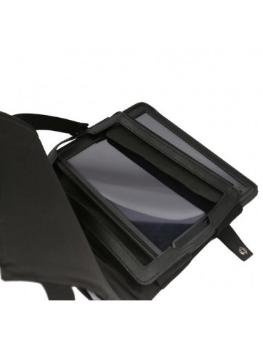 Chest harness designed to hold the iPad securely while allowing direct use thanks to a front-opening design, perfect for viewing or inputting information on set.