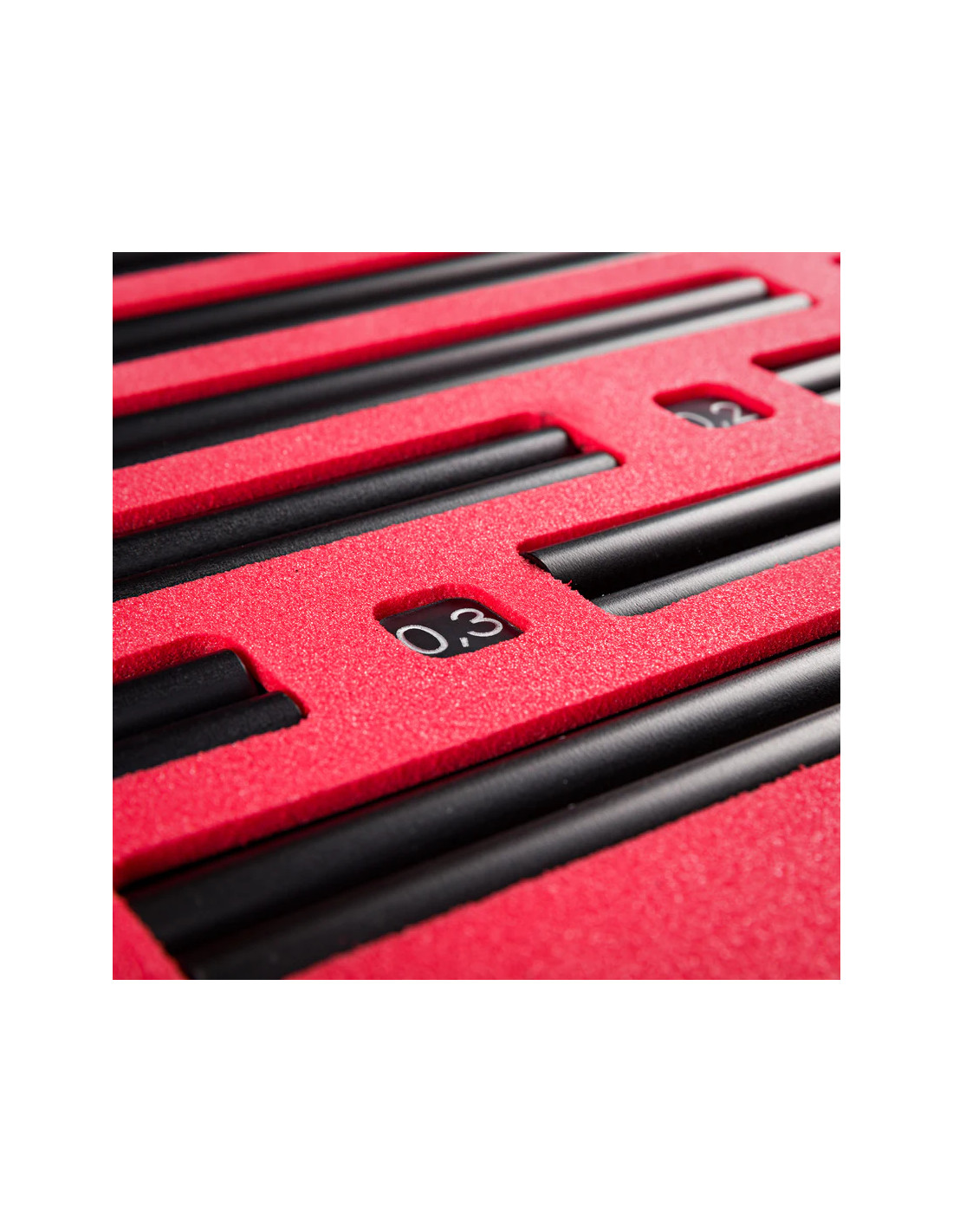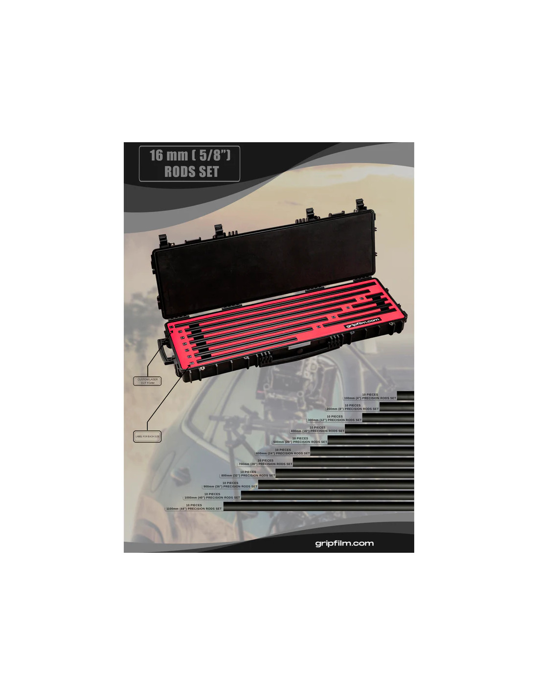 The 16mm (5/8”) Precision Rod Master Set includes 110 hollow aluminium rods with a full range of lengths from 100 mm (4") to 1100 mm (44"), all neatly organized in a black Explorer transport case with laser-cut red/black custom foam and clear labels for each size.