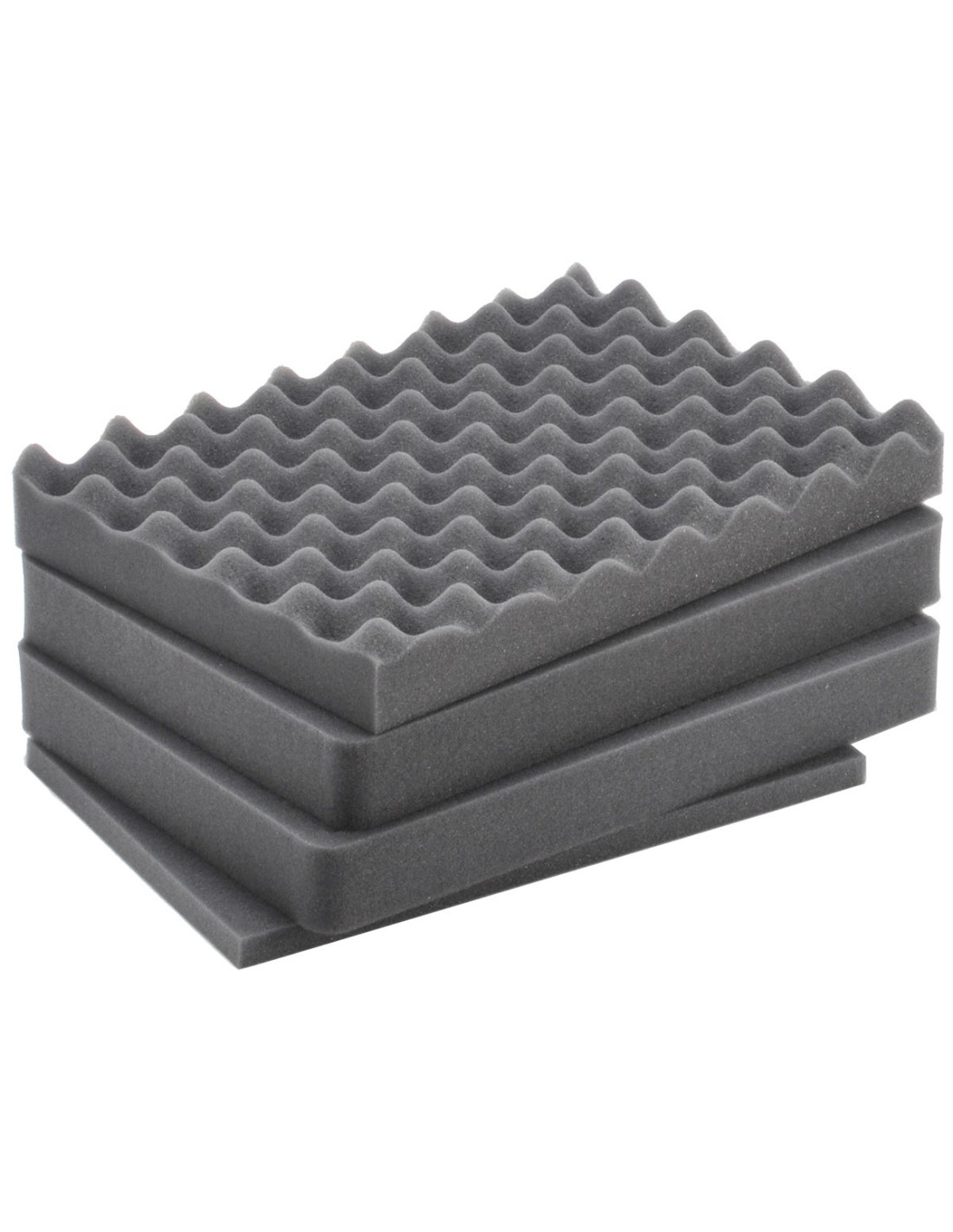 This foam kit includes a 5.1 cm convoluted polyurethane lid foam, two 4.4 cm Pick N Pluck base layers made of removable cubes for custom-fit compartments, and a 1.6 cm solid base foam layer.