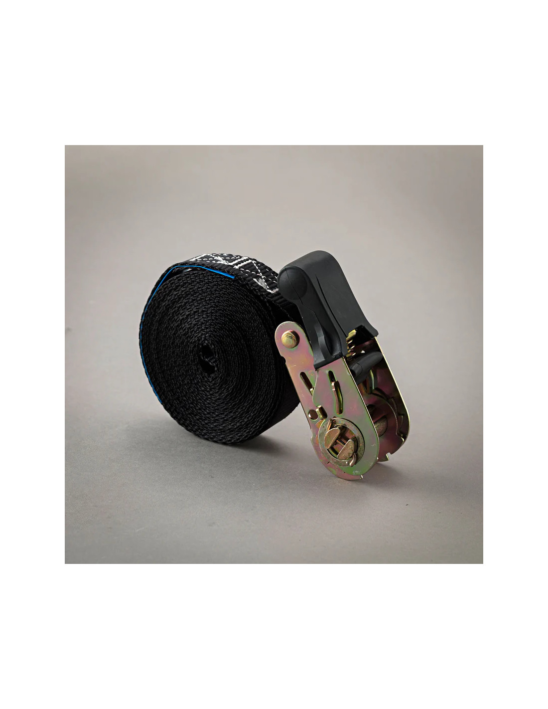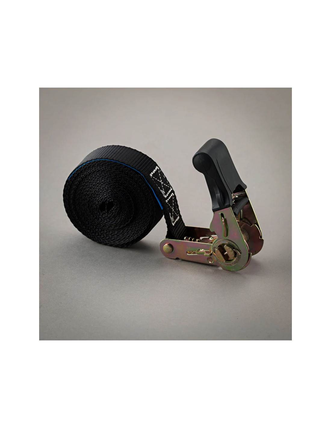 Crafted from heavy-duty, low-stretch polyester, this 5-meter black endless strap features a ratchet with a plastic-coated metal handle for comfortable use. Without end hooks, it loops directly around objects, making it perfect for rigging, bundling, or securing equipment. With a tensile force of 2000 daN and a load capacity of 200 kg, it's built for reliability on set or in transit.