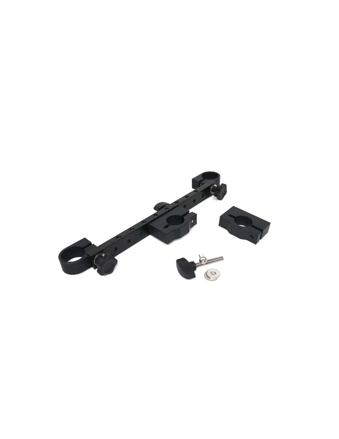 Le système inclut une barre courte et deux colliers de serrage compatibles avec les tubes de 35 mm de diamètre. Des filetages 3/8" sont intégrés pour permettre l’ajout rapide d’accessoires essentiels aux configurations de tournage mobiles.