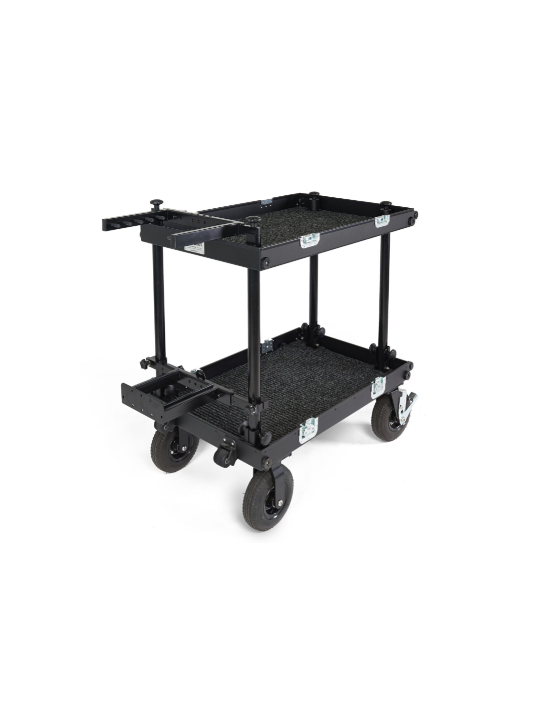 L’installation s’effectue sur le côté étroit du chariot, là où se trouvent les petites roues de transport. Ce support permet un gain de place important, tout en améliorant l’organisation et la rapidité d’intervention lors des déplacements ou des changements de décor.