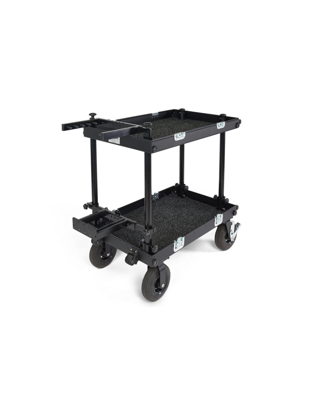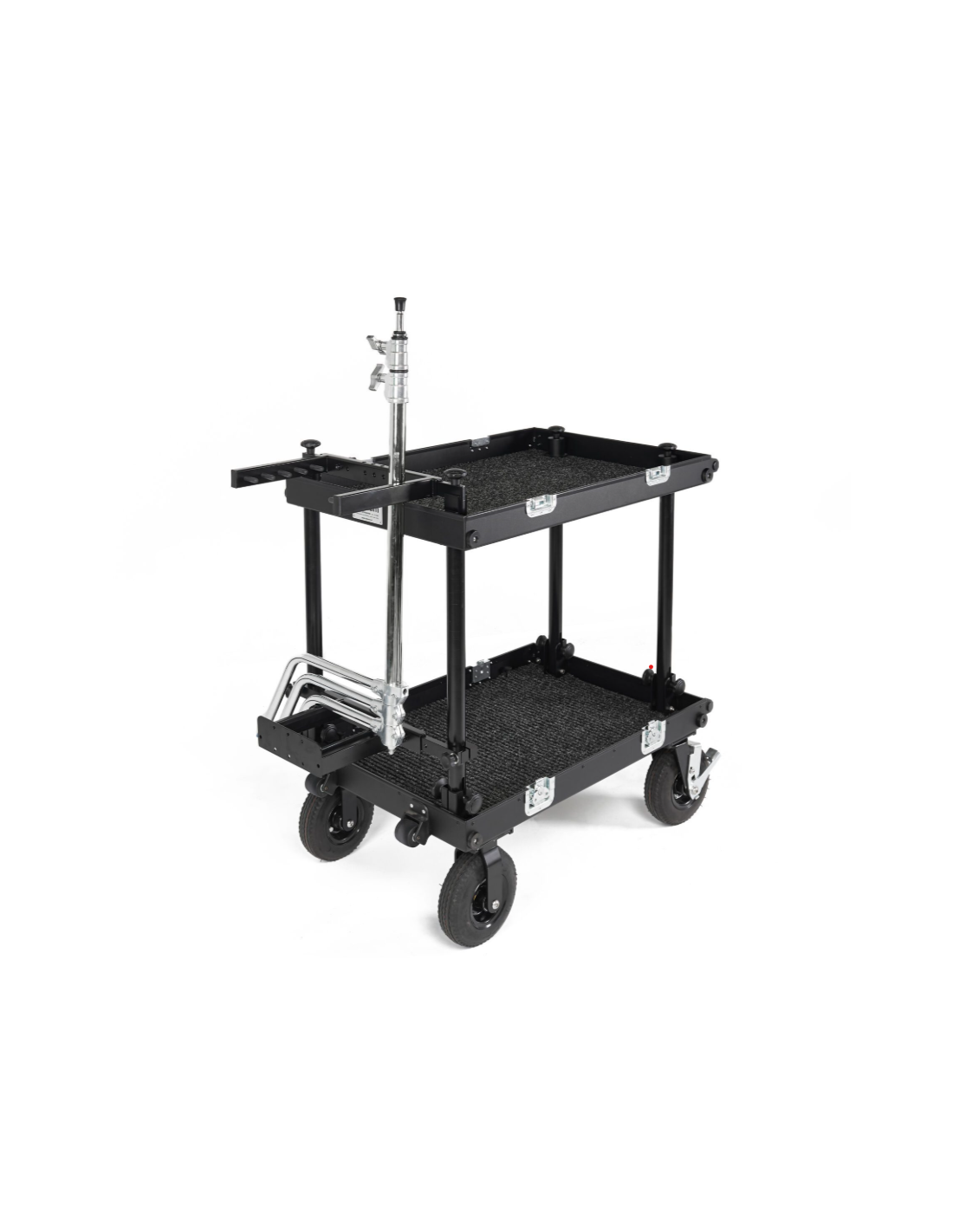 Le support se fixe sur le côté étroit du chariot, du côté des petites roues de transport, pour une organisation efficace et un encombrement réduit. Il peut être facilement retiré lorsqu’il n’est pas utilisé, permettant ainsi une grande modularité selon les besoins du tournage.