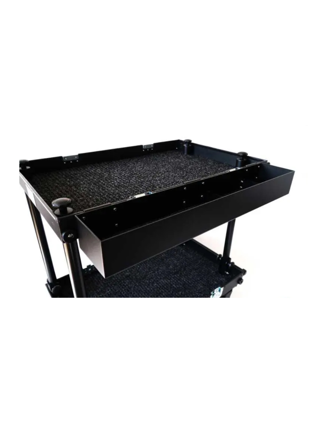 L'installation se fait sans outil, simplement en accrochant le bac sur le bord long du plateau supérieur du chariot. Sa conception discrète et stable en fait un accessoire idéal pour optimiser l’organisation sur les tournages mobiles tout en gardant l’accès fluide à l’équipement.