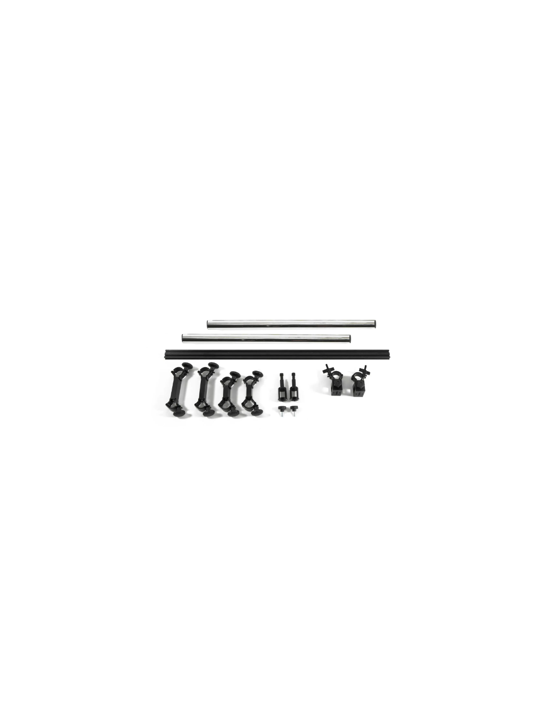2 × tubes 2 sections avec baby pin 5/8", 2 × rails, 2 × pinces transversales longues, 2 × pinces transversales courtes, 4 × baby pins 5/8", 4 × supports rail, 2 × réducteurs plastique