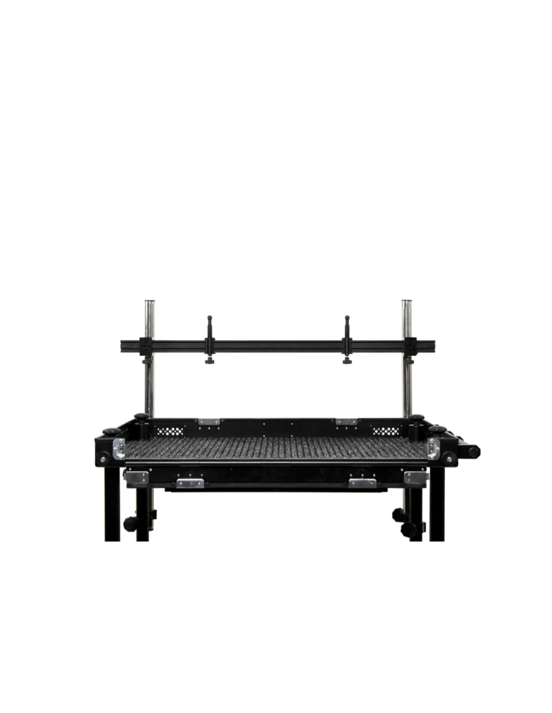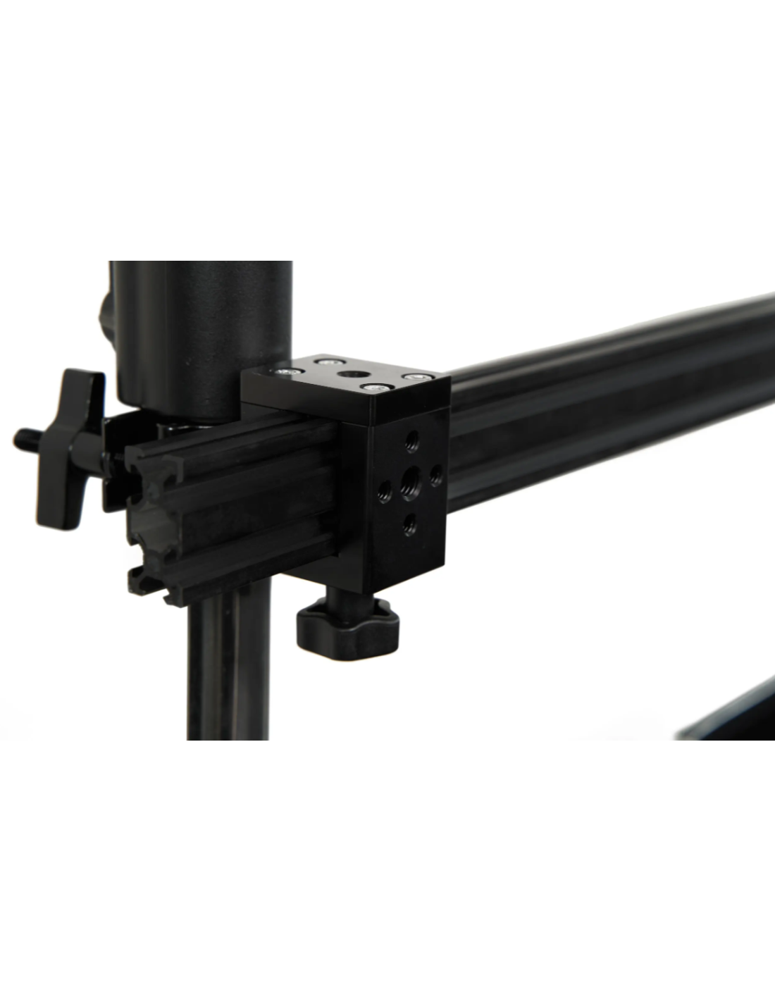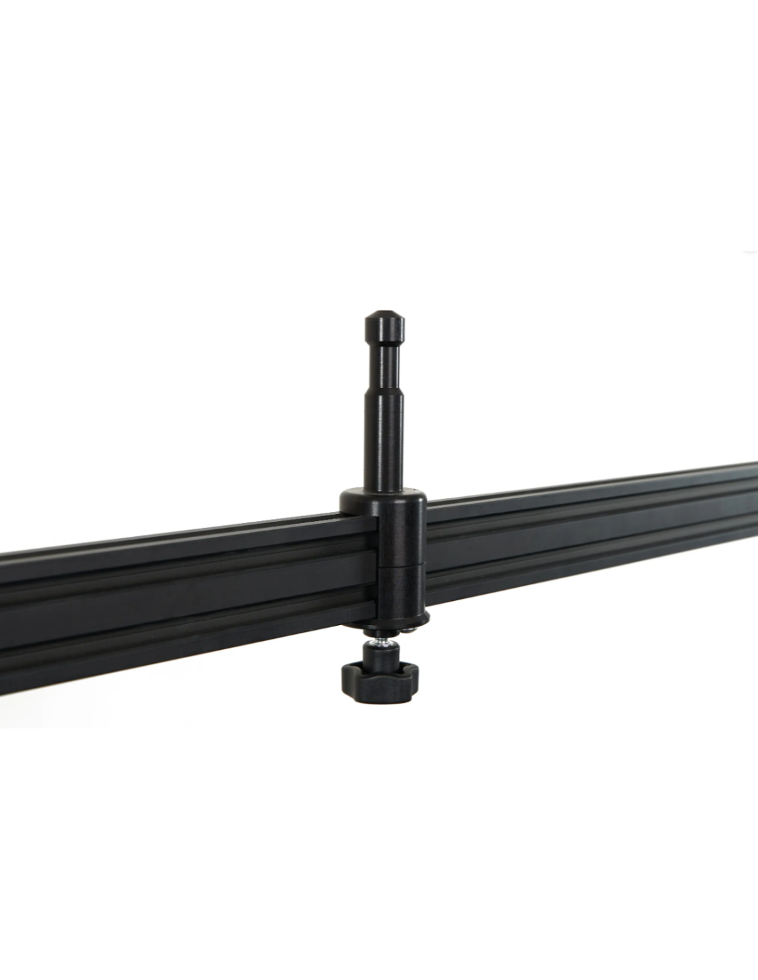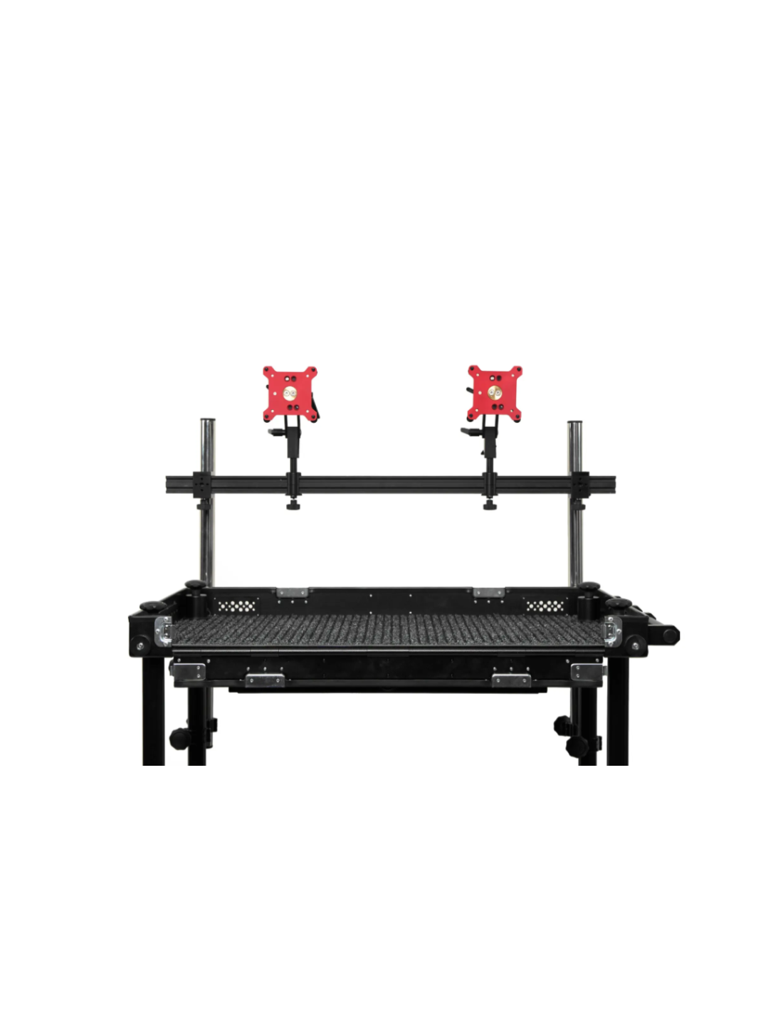 Le système se fixe facilement à la roulante à l’aide de tubes en aluminium et de pinces transversales (courtes et longues). Aucun démontage du plateau supérieur ni outil supplémentaire n’est requis. Chaque rail est équipé de deux supports avec pas de vis 1/4" et 3/8", compatibles avec la majorité des équipements vidéo/photo, et comprend deux pins 5/8" coulissants pour le montage VESA.