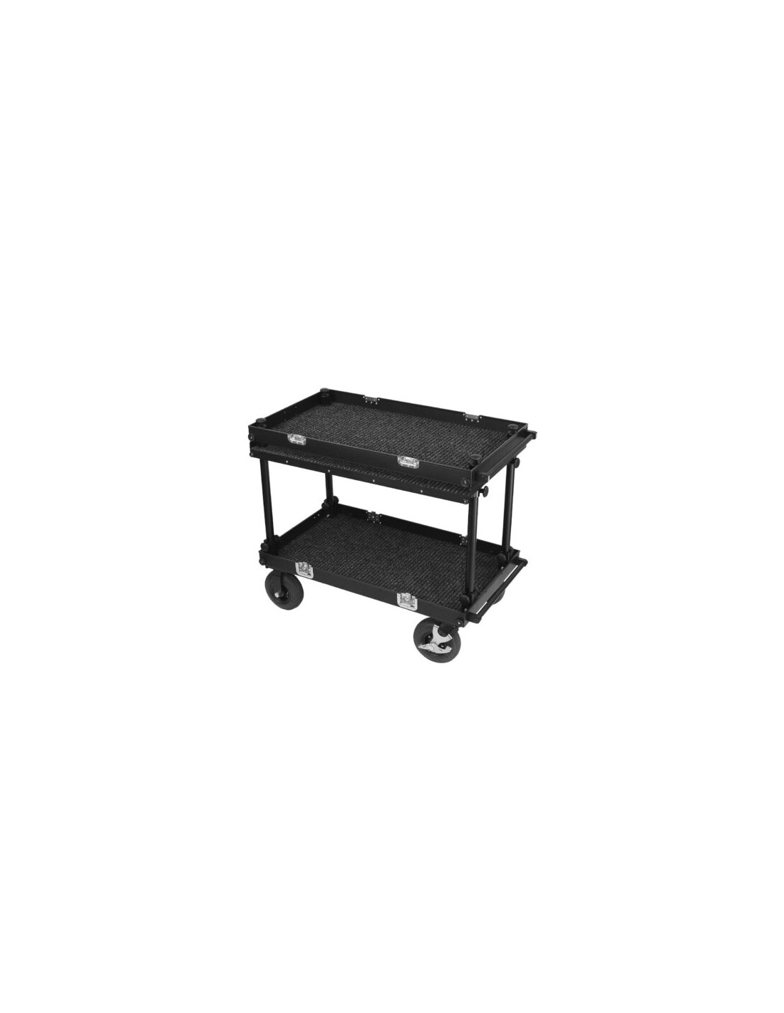 Fixée à l’aide d’un système de clamps réglables, cette étagère peut être positionnée à la hauteur souhaitée entre les deux plateformes principales de la roulante. Ce système offre une grande souplesse, mais désactive le pliage intégral de la roulante, car les clamps dépassent une fois installés.