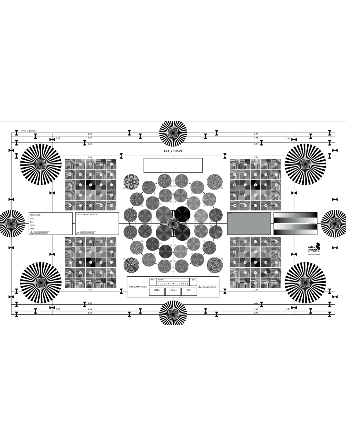 Elle intègre des cibles circulaires, linéaires et Siemens, des frame leaders, deux zones d’annotation technique, des chartes de gris (neutre, échelle, gradation) ainsi qu’une échelle wedge optique.