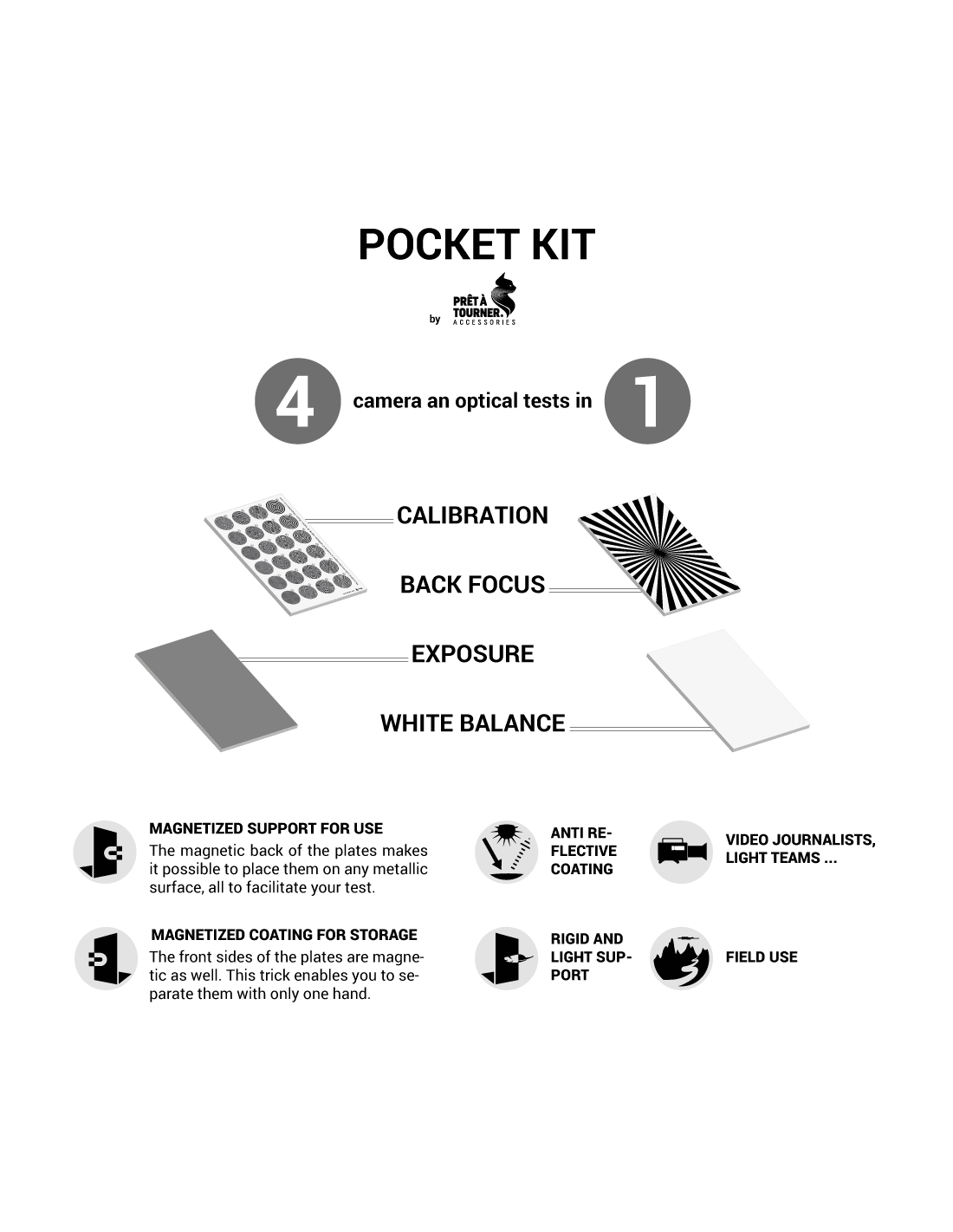 Grâce à ses plaques magnétiques recto-verso, il permet de réaliser rapidement des tests essentiels : netteté, centrage optique, back focus, balance des blancs et contrôle d’exposition.