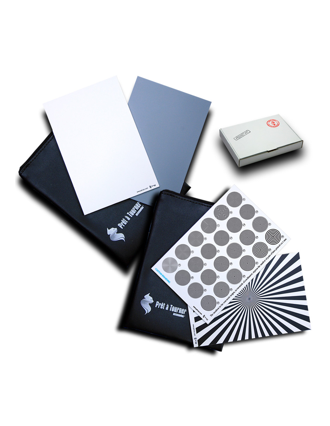 Le kit inclut une plaque à cibles circulaires haute définition, une plaque Siemens, une plaque gris neutre et une plaque blanc pur, toutes dotées d’un revêtement antireflet pour une lecture optimale.