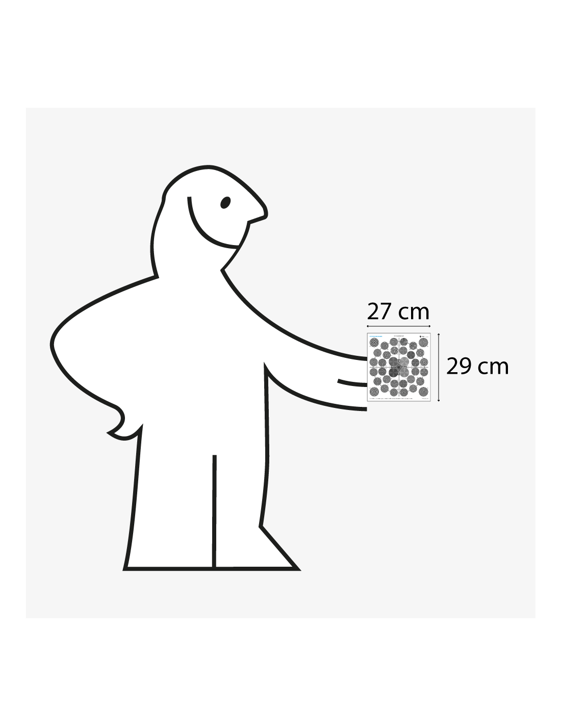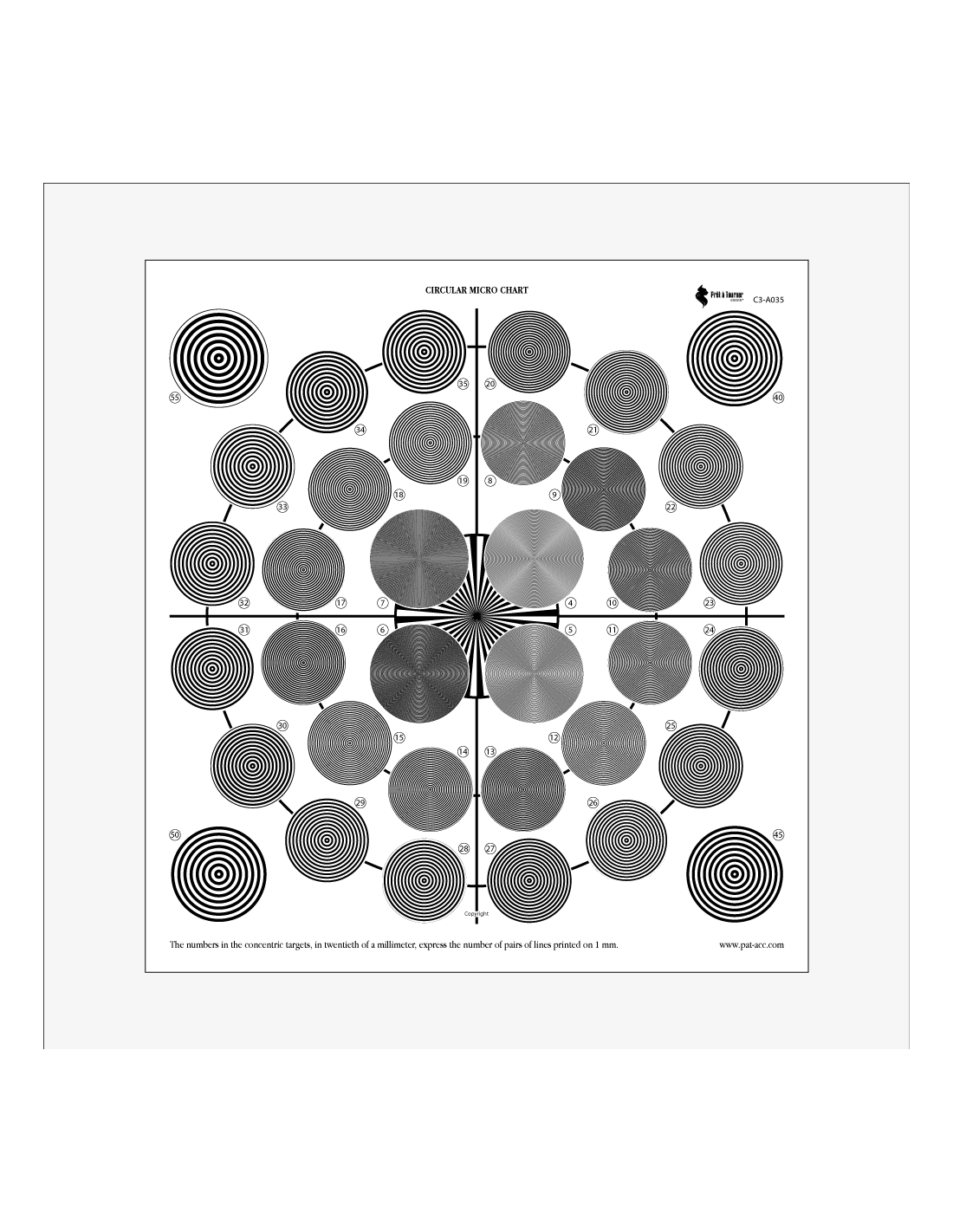 Composée de 36 cibles circulaires en très haute définition, elle permet d’évaluer la résolution, la netteté et la performance optique des objectifs sphériques, jusqu’à 250 paires de lignes imprimées sur le capteur.