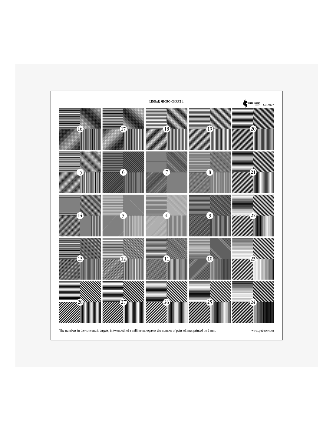 Sa surface d’analyse 25×25 cm comprend 25 mires linéaires aux espacements progressifs de 4 à 28, composées de lignes horizontales, verticales et diagonales permettant d’évaluer la netteté, le centrage et la performance optique des objectifs sphériques.