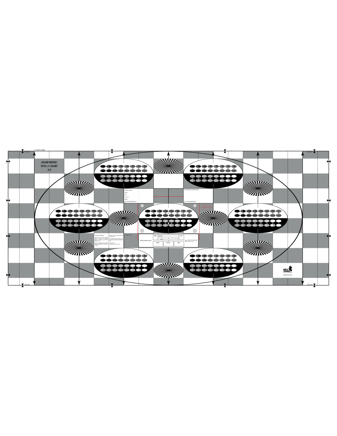 Elle inclut des cibles circulaires, linéaires et Siemens, deux zones d’annotation technique, une charte de gris neutre, une échelle wedge optique, un Color Checker Classic® ainsi qu’un miroir magnétique de centrage.