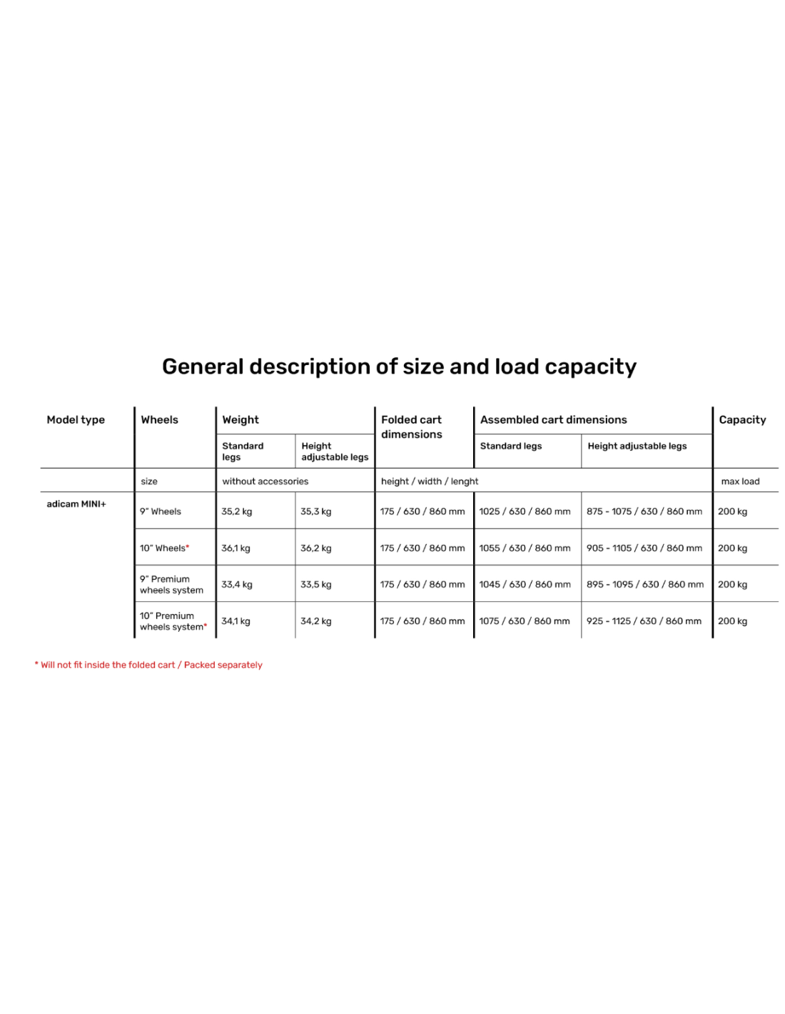 Avec ses 4 roues pneumatiques pliables manuellement (Ø225 mm) et ses roues additionnelles de transport, le MINI+ se plie et se déplie en 2 minutes, sans outil, et tient dans le coffre d’une voiture. Il supporte jusqu’à 200 kg de charge utile, tout en restant extrêmement maniable.