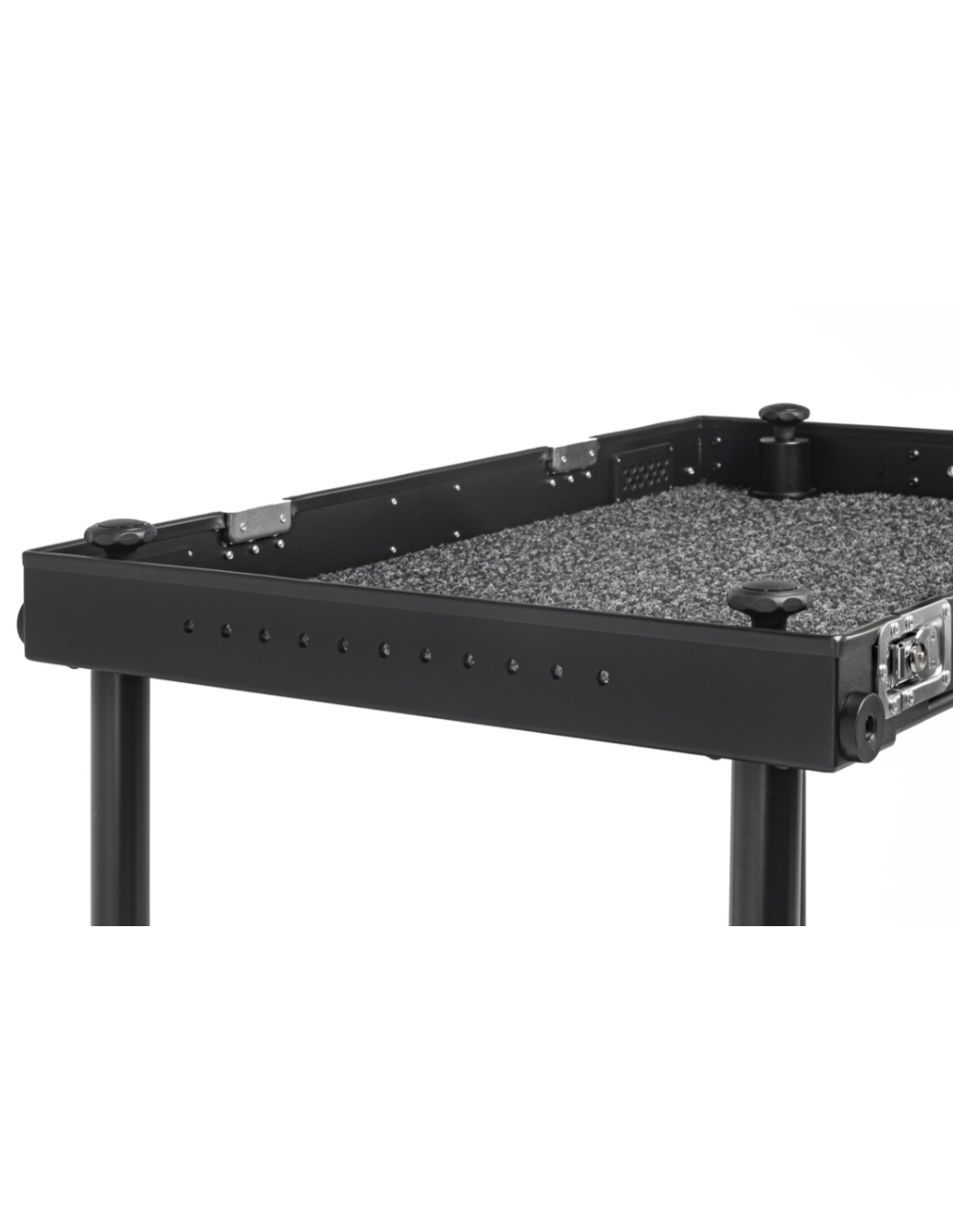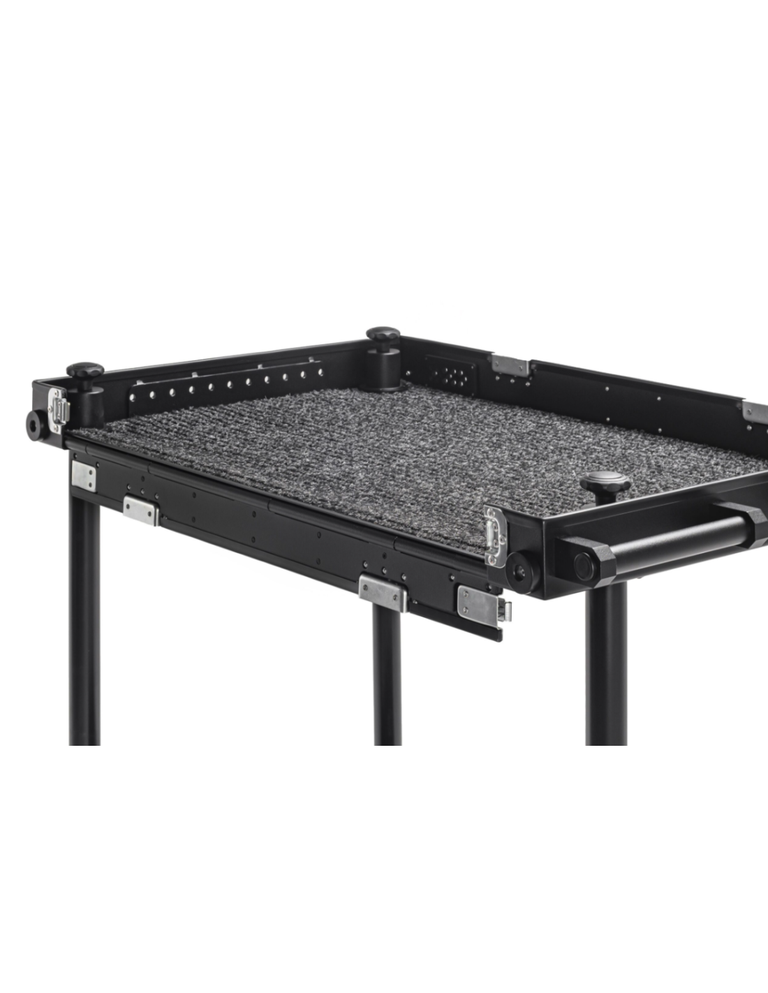 Le bord rabattable du plateau supérieur s’ouvre rapidement grâce à deux verrous latéraux, augmentant ainsi la surface de travail — parfaite pour un ordinateur portable, un clavier ou un écran de contrôle. Deux plaques filetées intégrées (mélange de pas 1/4" et 3/8") permettent de fixer facilement tous types d’accessoires.