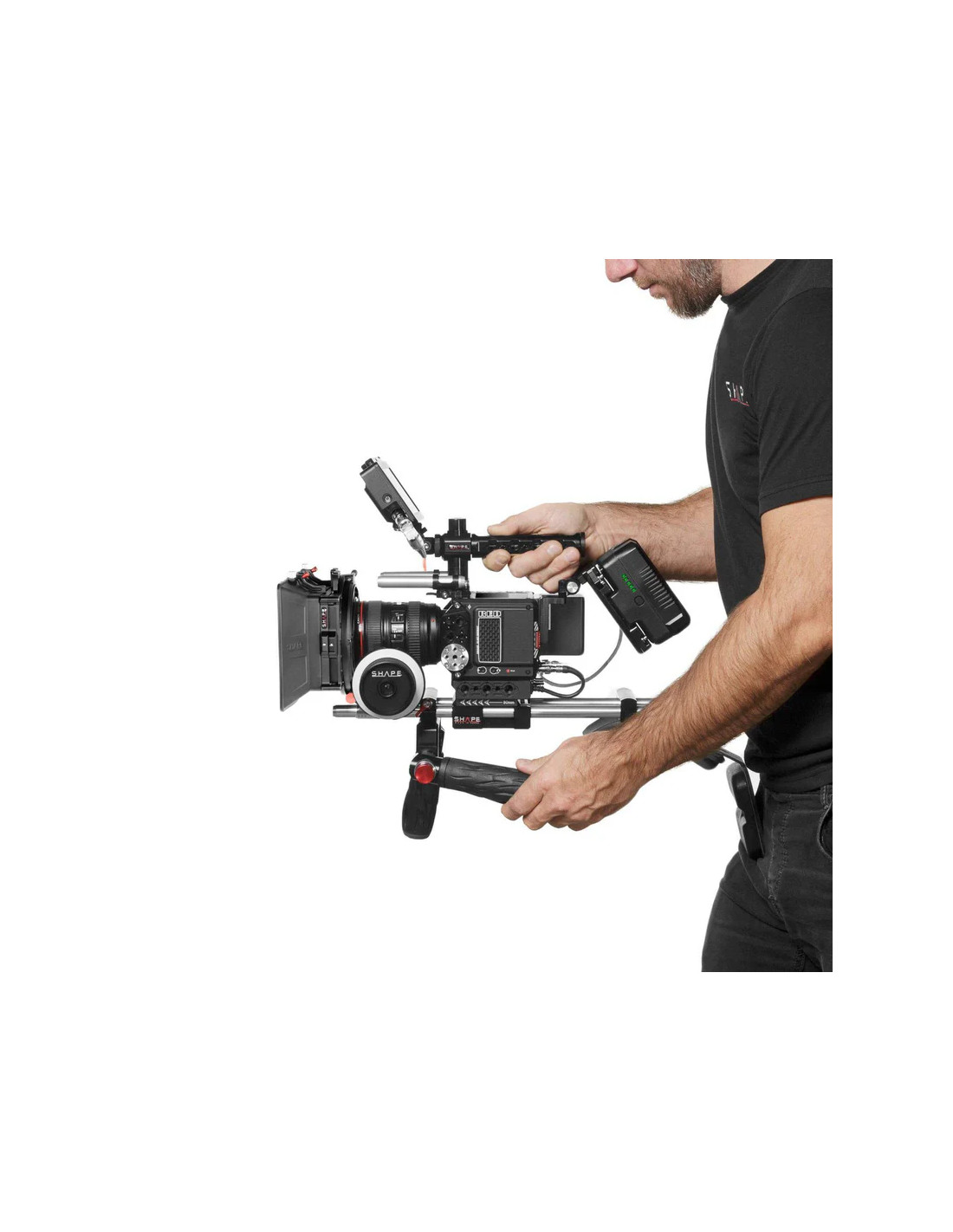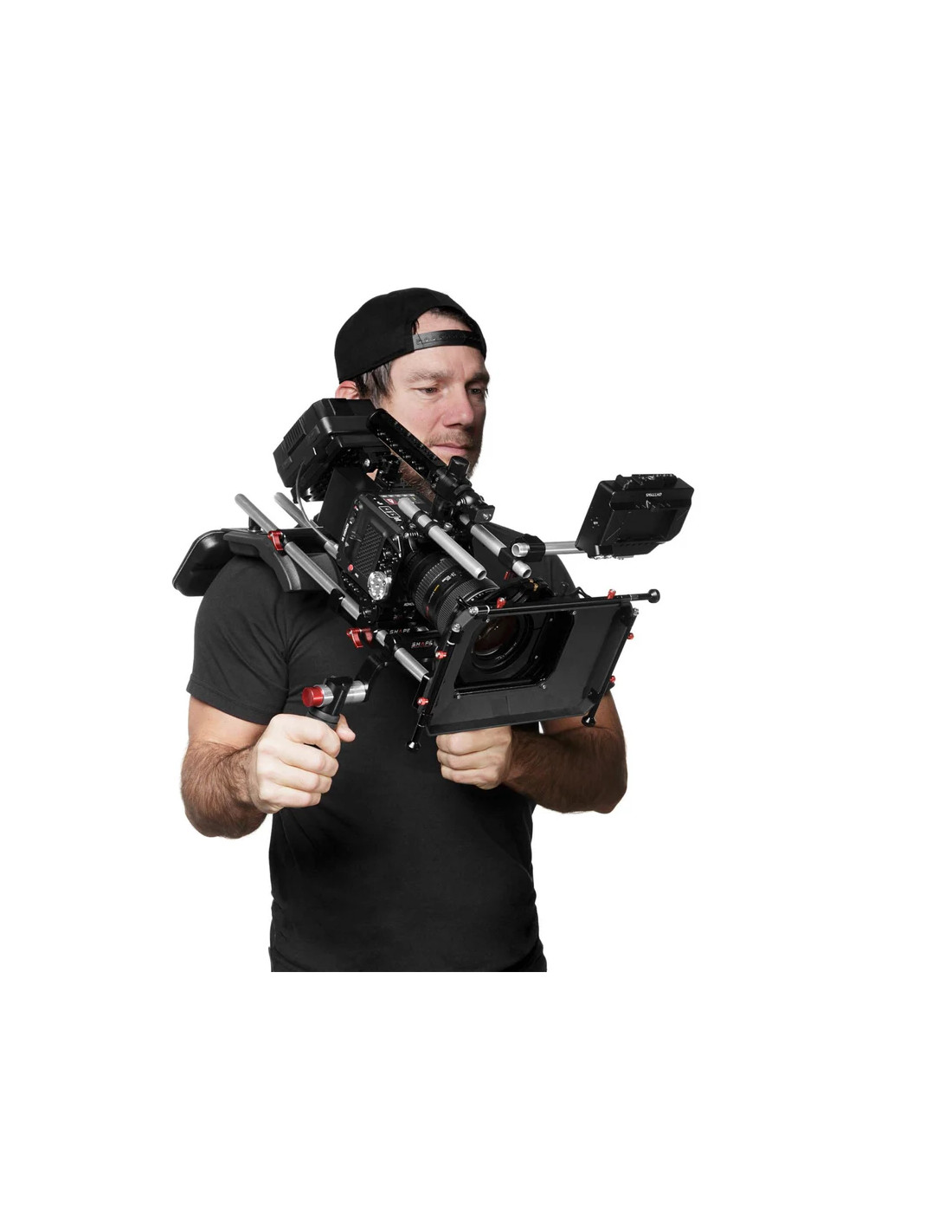 Ce rig complet intègre une cage ajustée, une plaque de base LW 15 mm avec adaptateur et queue d’aronde coulissante, une poignée rapide Push-Button avec bloc de tiges, ainsi qu’une épaulière rembourrée et ergonomique pour les tournages longue durée.