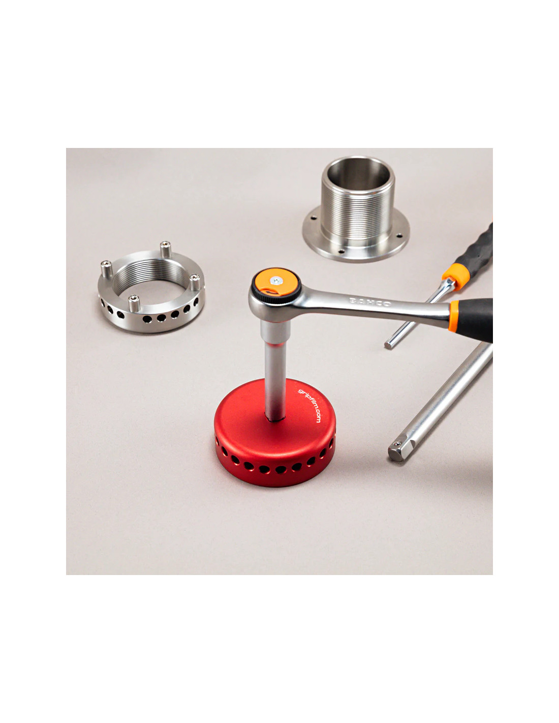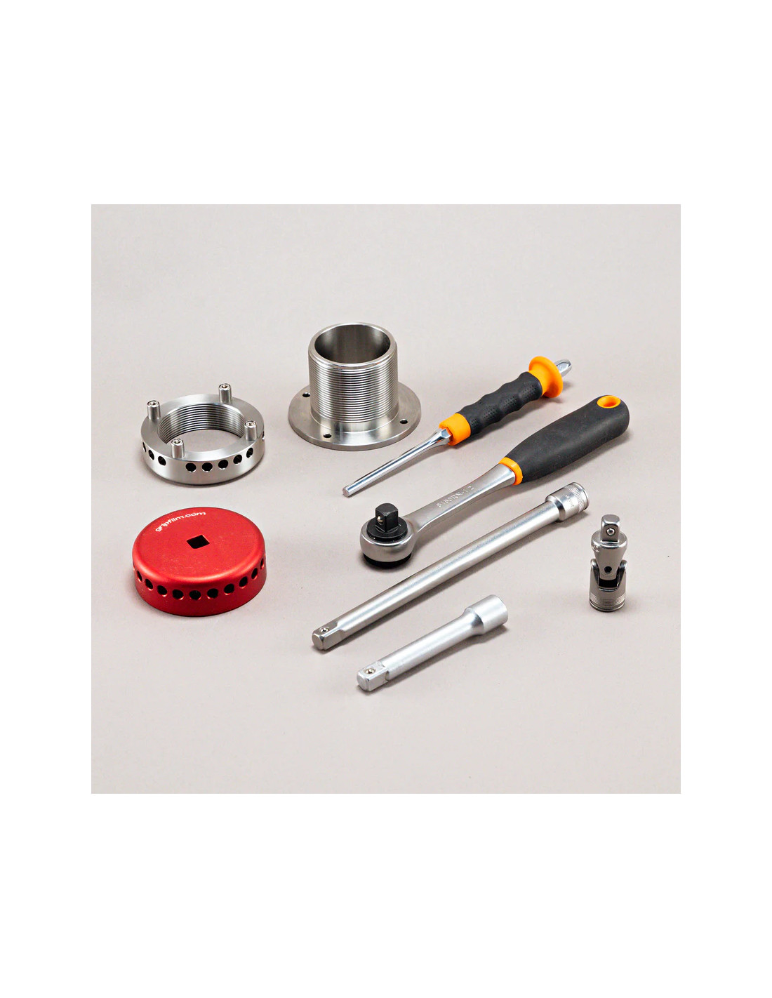 Le Mitchell Male Thread & Castlenut Set comprend un filetage mâle et une Castlenut en acier inoxydable, accompagnés d’un ensemble d’outils robustes pour un montage sécurisé et rapide. Il inclut une clé rouge 1/2", un cliquet réversible, une articulation, deux rallonges (125 mm et 250 mm), un chasse-goupille 8 mm, ainsi que la visserie nécessaire. Les composants sont en acier inoxydable et en aluminium anodisé rouge haute résistance, assurant longévité et fiabilité dans les conditions exigeantes de tournage.