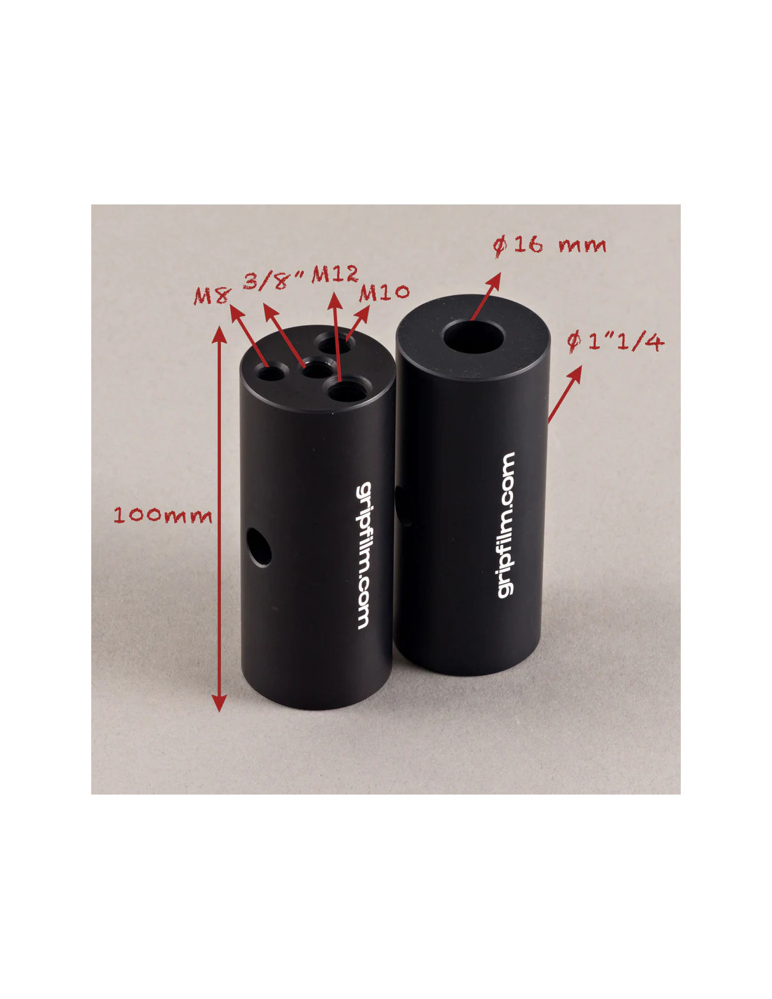 Avec un diamètre extérieur de 42 mm (1"1/4), chaque pin est parfaitement adapté aux récepteurs standard grip. Le récepteur central 16 mm (5/8") accepte les spigots, bras articulés ou embouts classiques, tandis que le filetage femelle 3/8” central et les filetages latéraux M8, M10 et M12 offrent une compatibilité étendue avec une multitude d’accessoires.