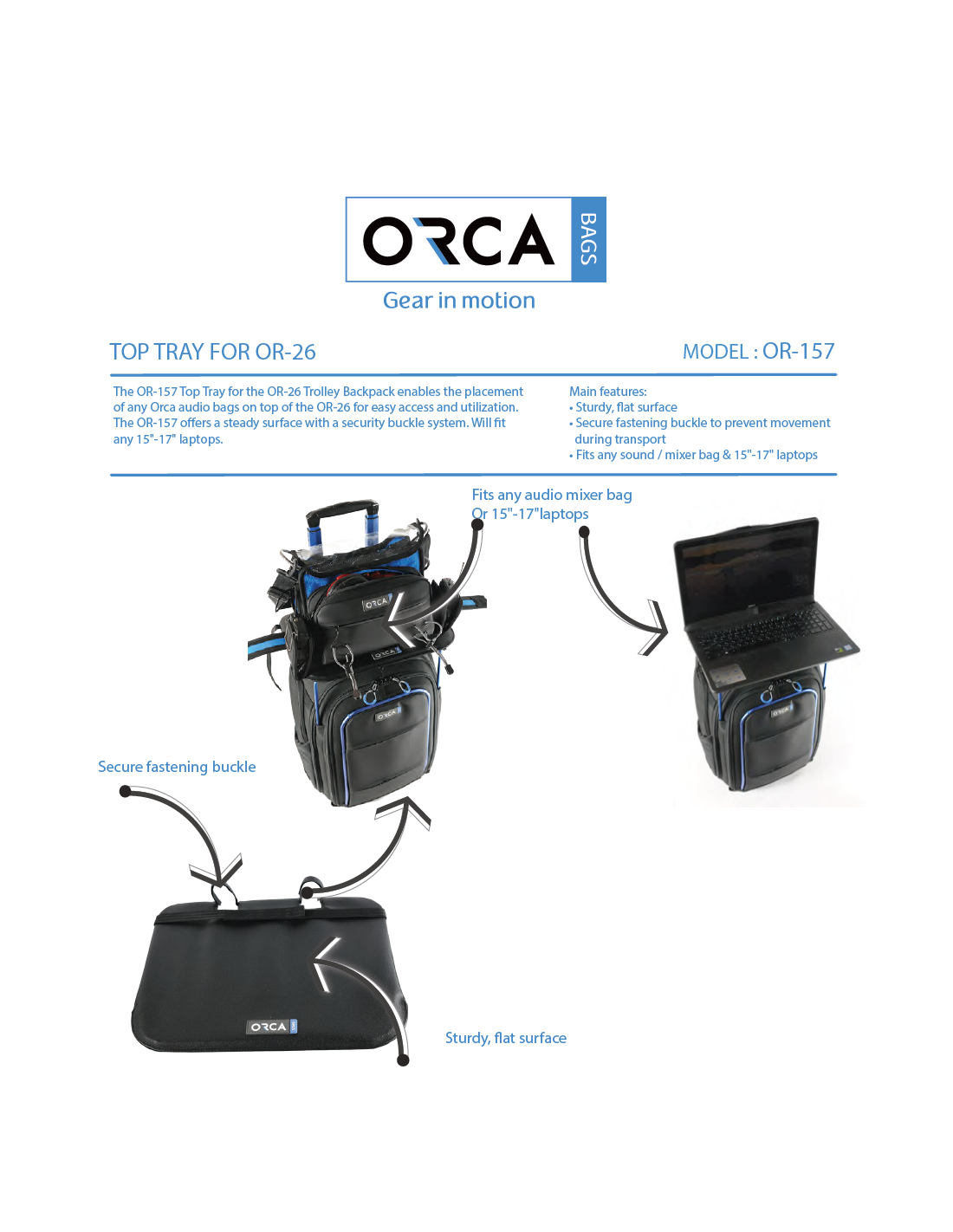 Sa surface plane et robuste est adaptée aussi bien aux sacoches audio qu’aux ordinateurs portables de 15″ à 17″, faisant du OR-157 un accessoire indispensable pour les configurations mobiles et les longues journées de tournage.